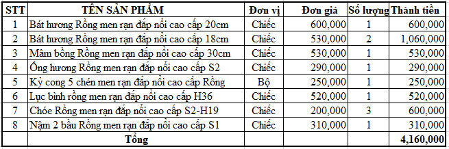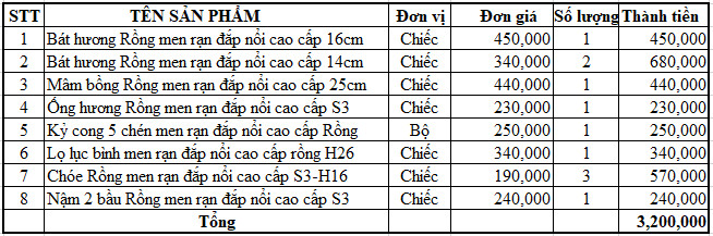 + Kích thước: tuỳ theo kích thước của mỗi bàn thờ mà gia chủ có thể chọn các bộ sau: