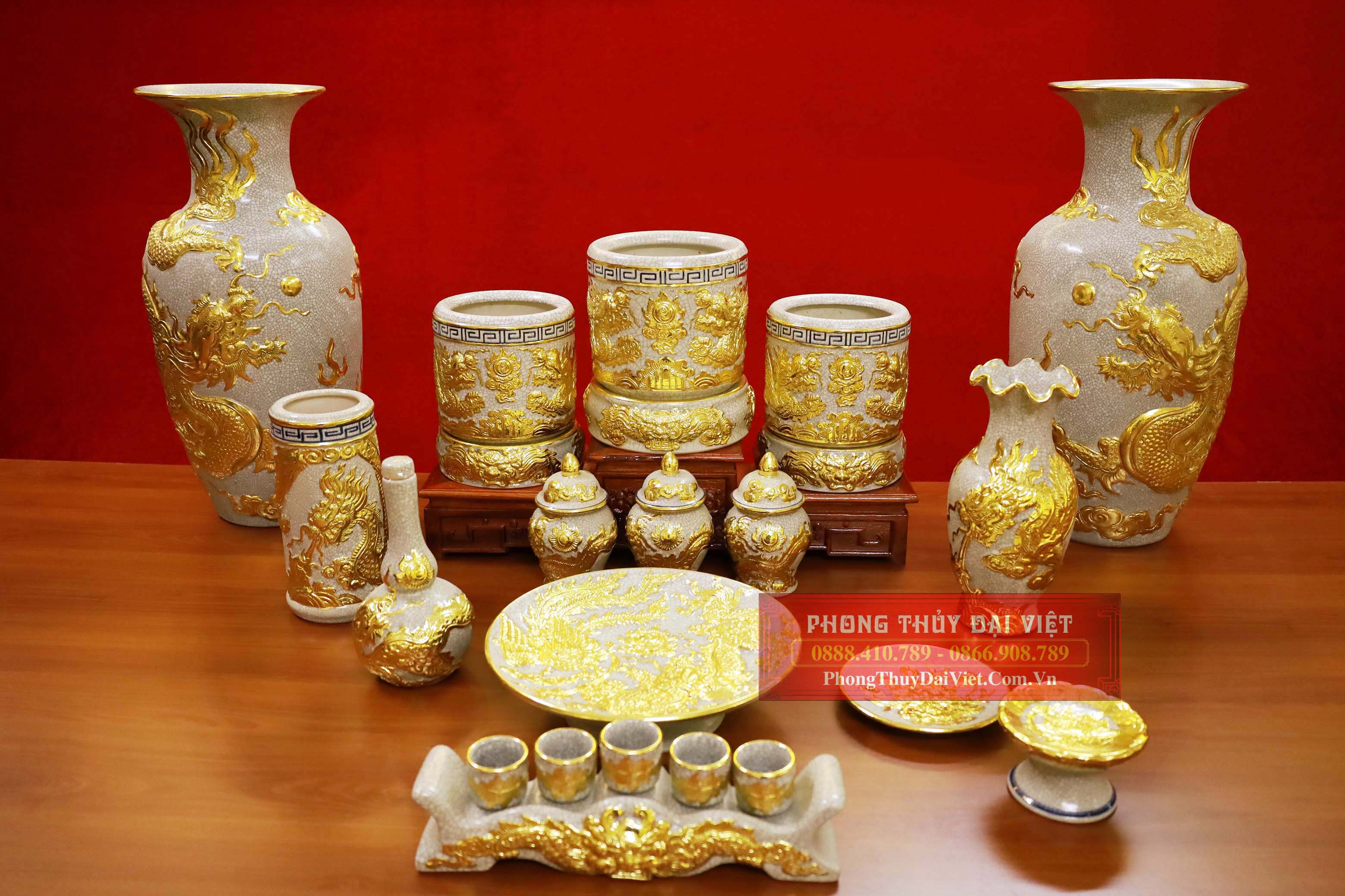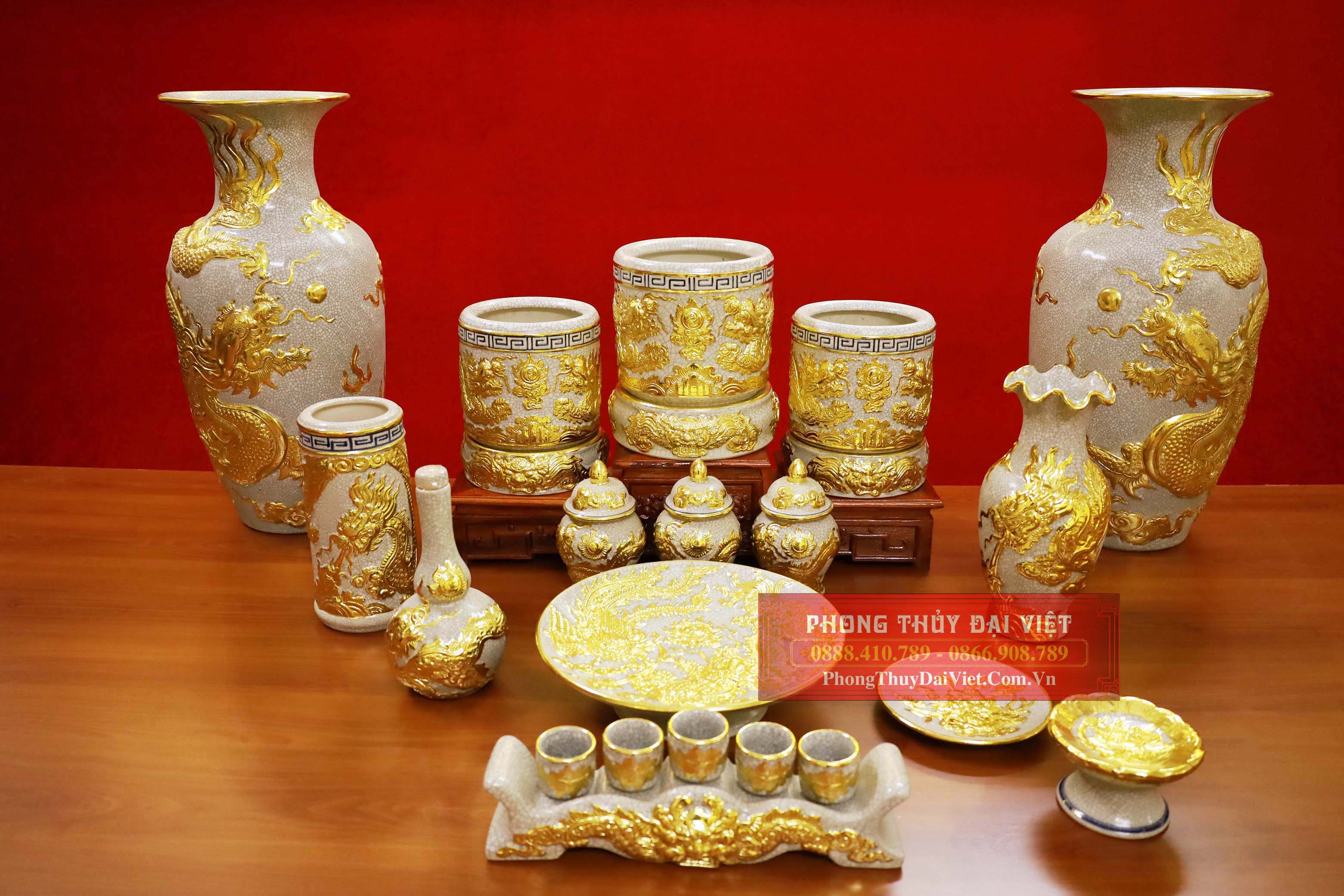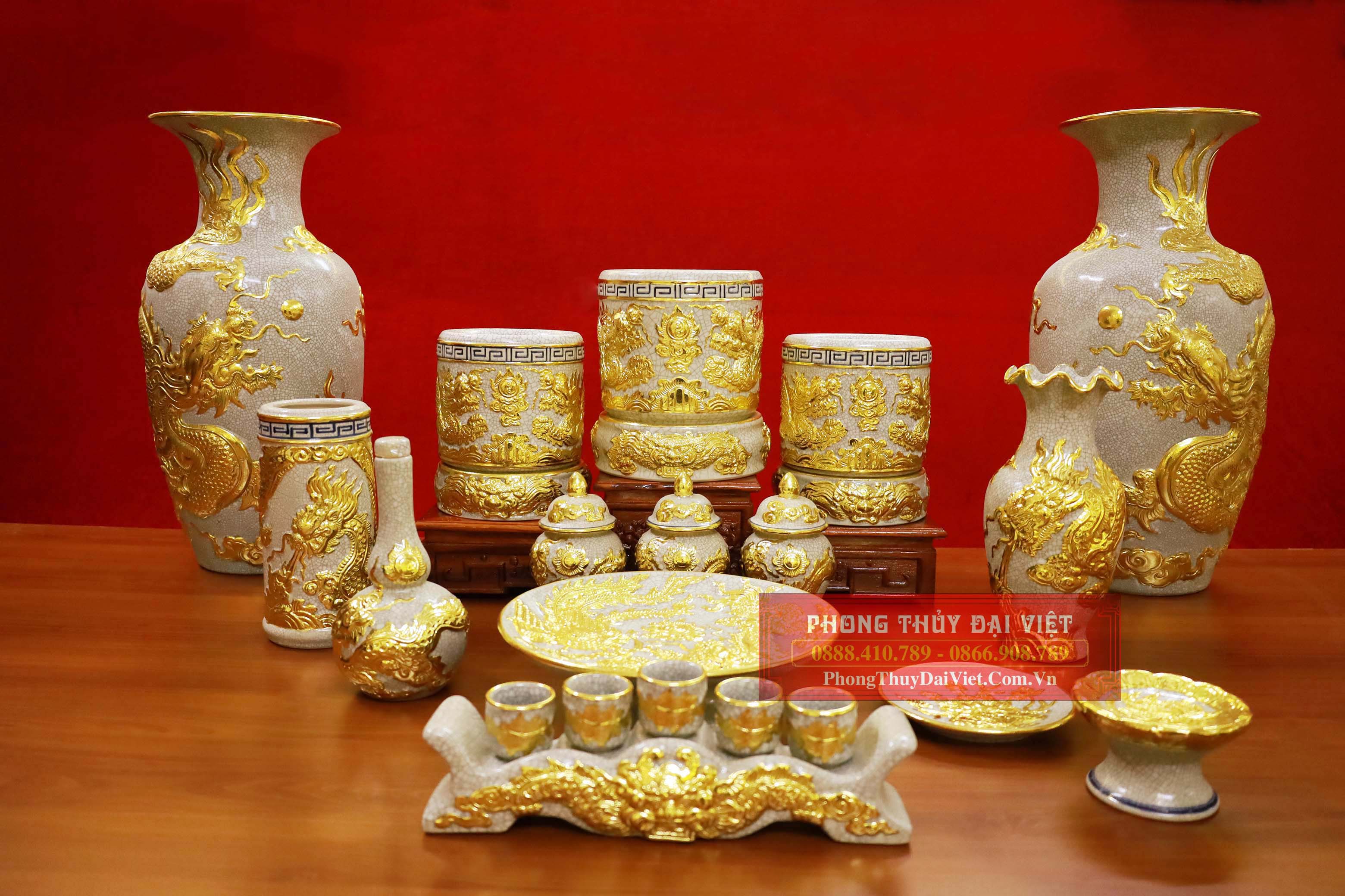 Bộ đồ thờ men rạn bát tràng dát vàng 24k - ban gia tiên và thần linh - DV05
