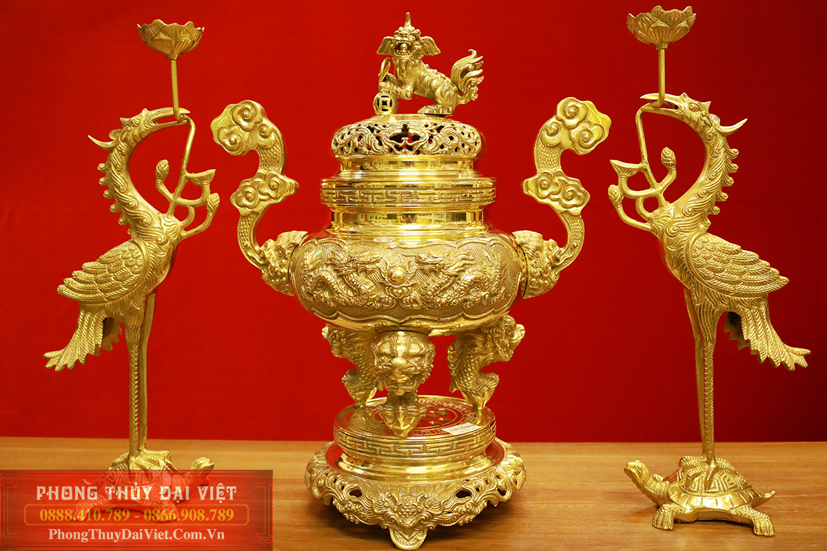 Bộ tam sự chạm rồng đồng vàng bóng (cặp hạc)