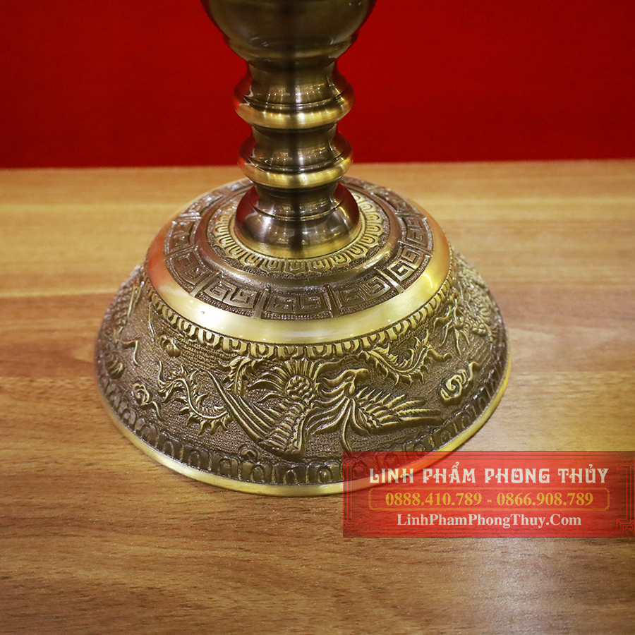 Cặp chân nến tượng trưng cho âm dương, có hình bát úp với hoa văn sắc nét được thiết kế một cách vững chãi. Phần đế của cặp nến là chi tiết tứ linh: Long, lân, quy phụng hội tụ giúp trấn trạch, ngăn chặn tà khí xâm nhập và mang đến may mắn, bình an cho gia đình.