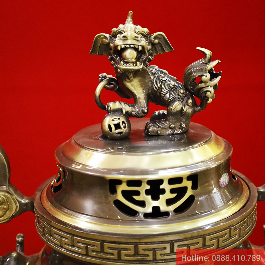 Đỉnh đồng là biểu tượng tượng trưng cho mặt trời. Do đó, bộ phần này luôn thể hiện sự vững chãi, uy nghiêm của ban thờ. Đỉnh đồng gồm có: Đế, thân và nắp đỉnh. Trong đó, nắp đỉnh nổi bật với tượng Nghê đang ngậm viên ngọc mang ý nghĩa bảo vệ và xua đuổi những điều không may mắn đến với gia chủ. Thân đỉnh có cặp rồng được chạm khắc tinh xảo, sắc nét với hoa văn nổi bật.
