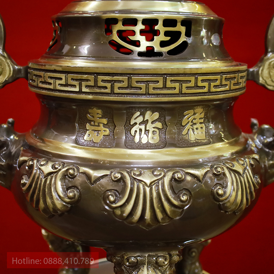 Đặc biệt, tại thân đỉnh cũng được chạm hoạ tiết bông hoa sòi tượng trưng cho 5 chữ: Phúc, Lộc, Thọ, Khang, Ninh để bày tỏ những mong ước viên mãn cho gia chủ, gia đạo.
