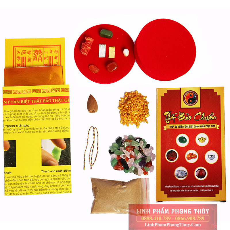 Ngoài ra kèm theo mỗi bộ thất bảo Linh Phẩm Phong Thủy còn tặng thêm đầy đủ các vật phẩm để phục vụ đầy đủ cho các công tác bốc bát hương, nạp cốt tượng thờ cúng thần, phật, thần tài, thổ công, gia tiên ... như: Giấy Trang Kim, Tờ Hiệu (2 tờ), Chỉ ngũ sắc, Gói ngũ vị hương, Gói thạch anh ngũ sắc vụn dùng để rải dưới đáy bát hương giúp tăng vượng khí cho việc thờ cúng, Hương trầm dùng sông và tẩy uế và kèm theo tờ hướng dẫn chi tiết cách bốc bát hương và văn khấn, chú đại bi an vị bát hương.