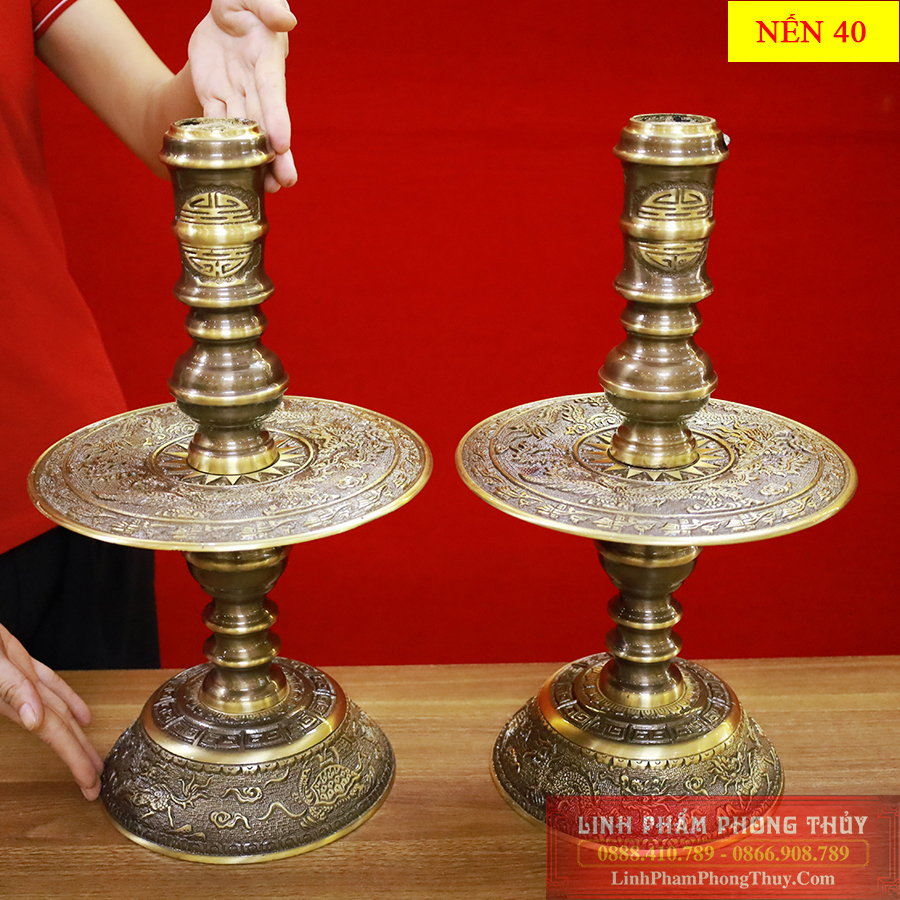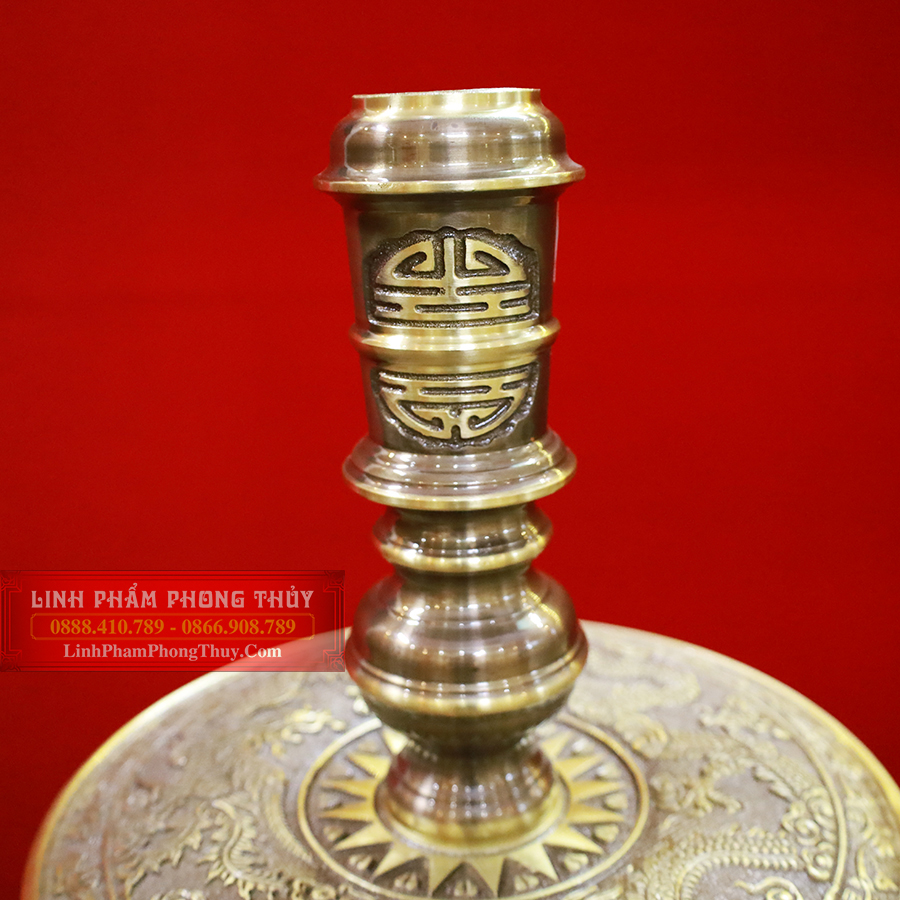 Cặp chân nến tượng trưng cho âm dương, có hình bát úp với hoa văn sắc nét được thiết kế một cách vững chãi. Phần đế của cặp nến là chi tiết tứ linh: Long, lân, quy phụng hội tụ giúp trấn trạch, ngăn chặn tà khí xâm nhập và mang đến may mắn, bình an cho gia đình.