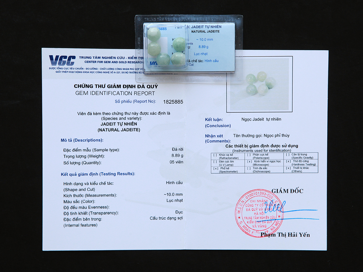 Ngọc phỉ thúy tự nhiên đã kiểm định chất lượng tại VGC được Linh Phẩm Phong Thủy sử dụng trong bộ cốt thất bảo đặc biệt.