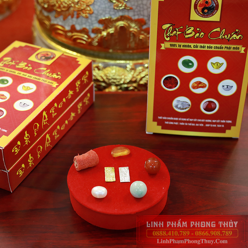 Bộ thất bảo Cao Cấp gồm có bảy bảo vật quý mà nhà phật thường hay sử dụng đó là: Vàng thật, Bạc thật, Hổ Phách tự nhiên , Ngọc phỉ thúy tự nhiên, Mã Não đỏ tự nhiên, Xà Cừ (Ngọc trai) tự nhiên, san hô đỏ tự nhiên, bảy vật phẩm trên đều được Linh Phẩm Phong Thủy lựa chọn kỹ càng và đã kiểm định chất lượng tại các trung tâm kiểm định uy tín.