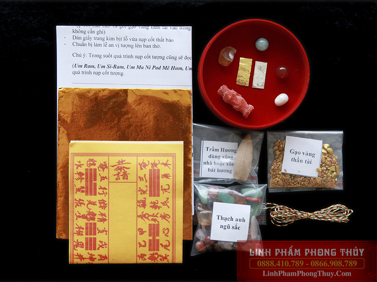 + Vật phẩm tặng kèm theo mỗi bộ thất bảo: Gói gạo vàng thần tài, Gói thạch anh ngũ sắc, Tờ Hiệu (Dùng để ghi tên người được thờ), giấy trang kim (dùng để gói bộ thất bảo và tờ hiệu), chỉ ngũ sắc, gói bột thơm ngũ vị hương và nụ trầm hương dùng để xông bát hương hoặc xông nhà để trừ tà khí.