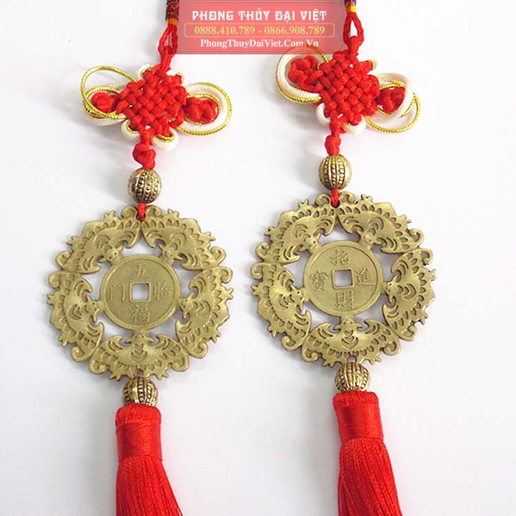 + Ý nghĩa: Trong tiếng Trung Quốc, từ “dơi” và từ “phúc” là đồng âm. Chính vì vậy, dơi (còn gọi là phúc thử) trở thành con vật tượng trưng cho sự cát tường. Con dơi gắn với đồng tiền là hình ảnh dẫn phúc chiêu tài, …Treo dây ngũ phúc lâm môn tượng trưng cho sự cát tường, dẫn phúc chiêu tài, …