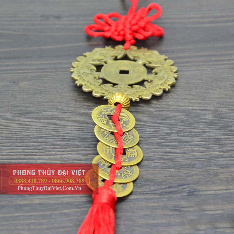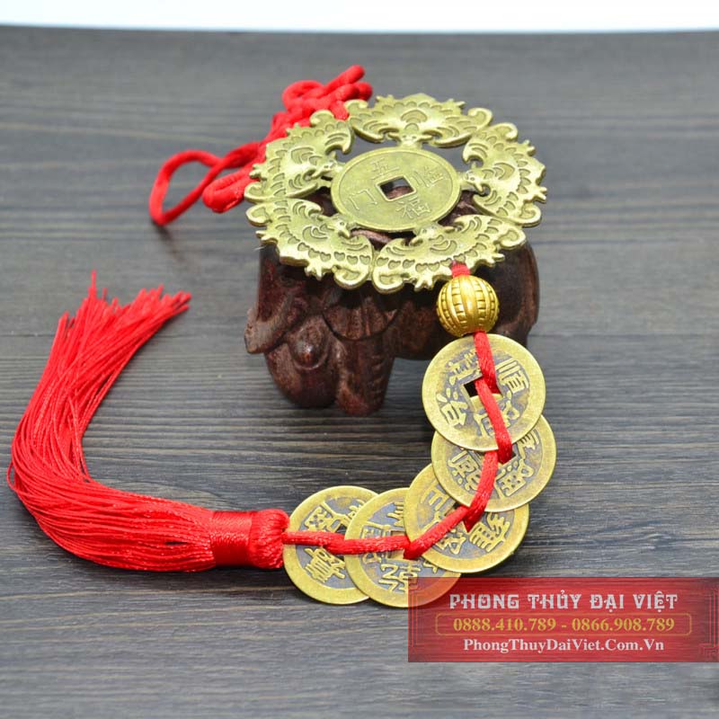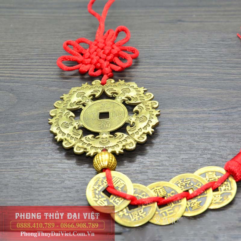 - Bộ sản phẩm gồm: dây treo có 1 hạt xâu mạ đồng, 1 xu ngũ phúc lâm môn, 5 xu tiền cổ