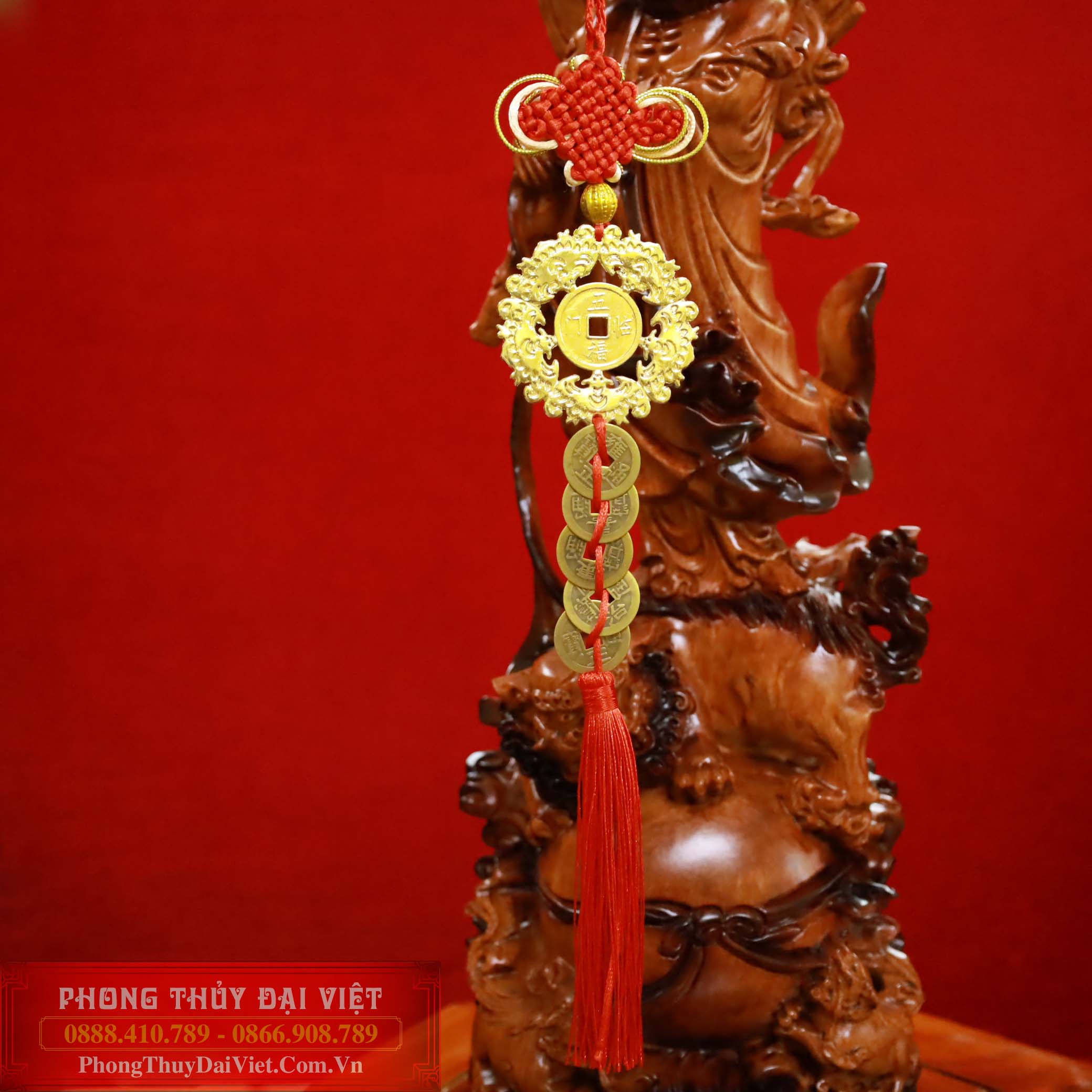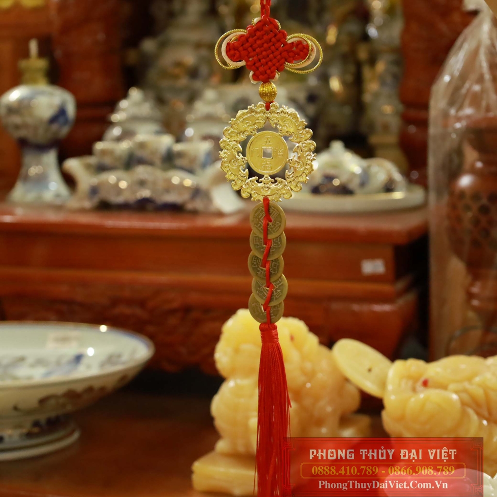 - Bộ sản phẩm gồm: dây treo có 1 hạt xâu mạ đồng, 1 xu ngũ phúc lâm môn, 5 xu tiền cổ