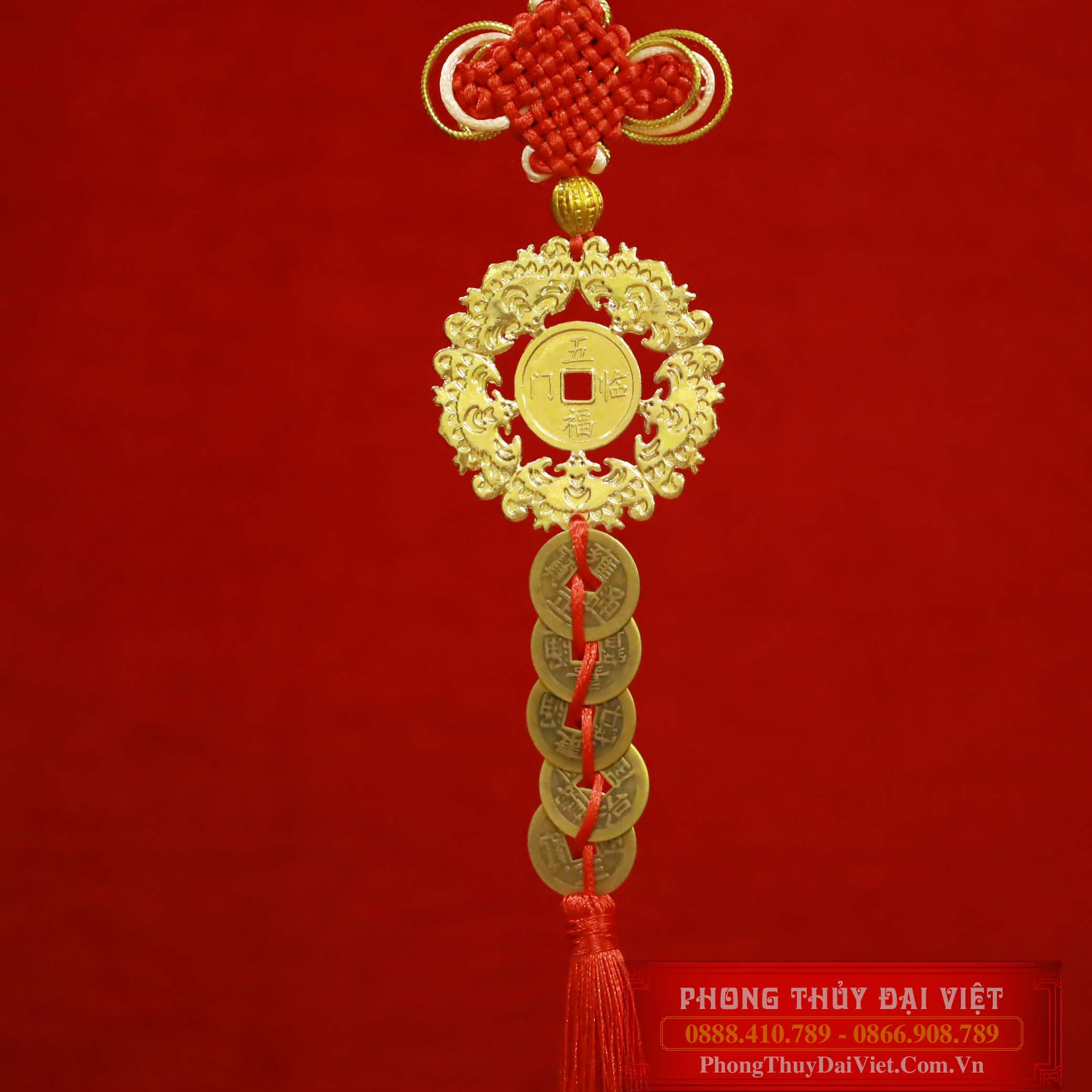 Dây treo ngũ phúc lâm môn mạ vàng kết xu ngũ đế