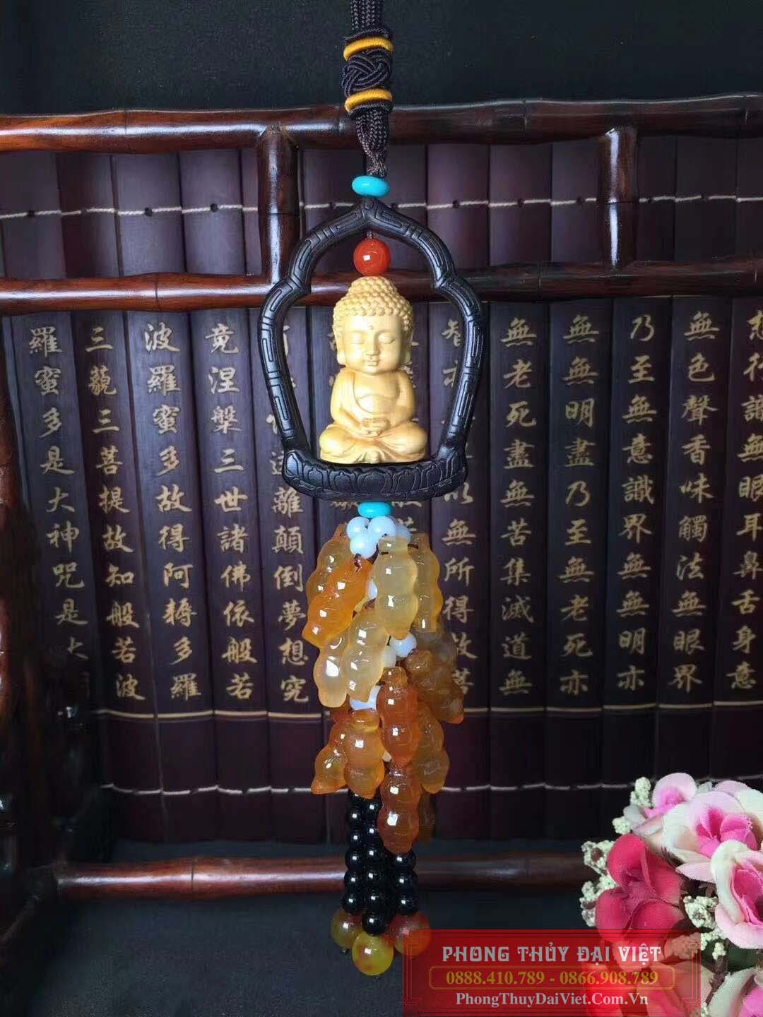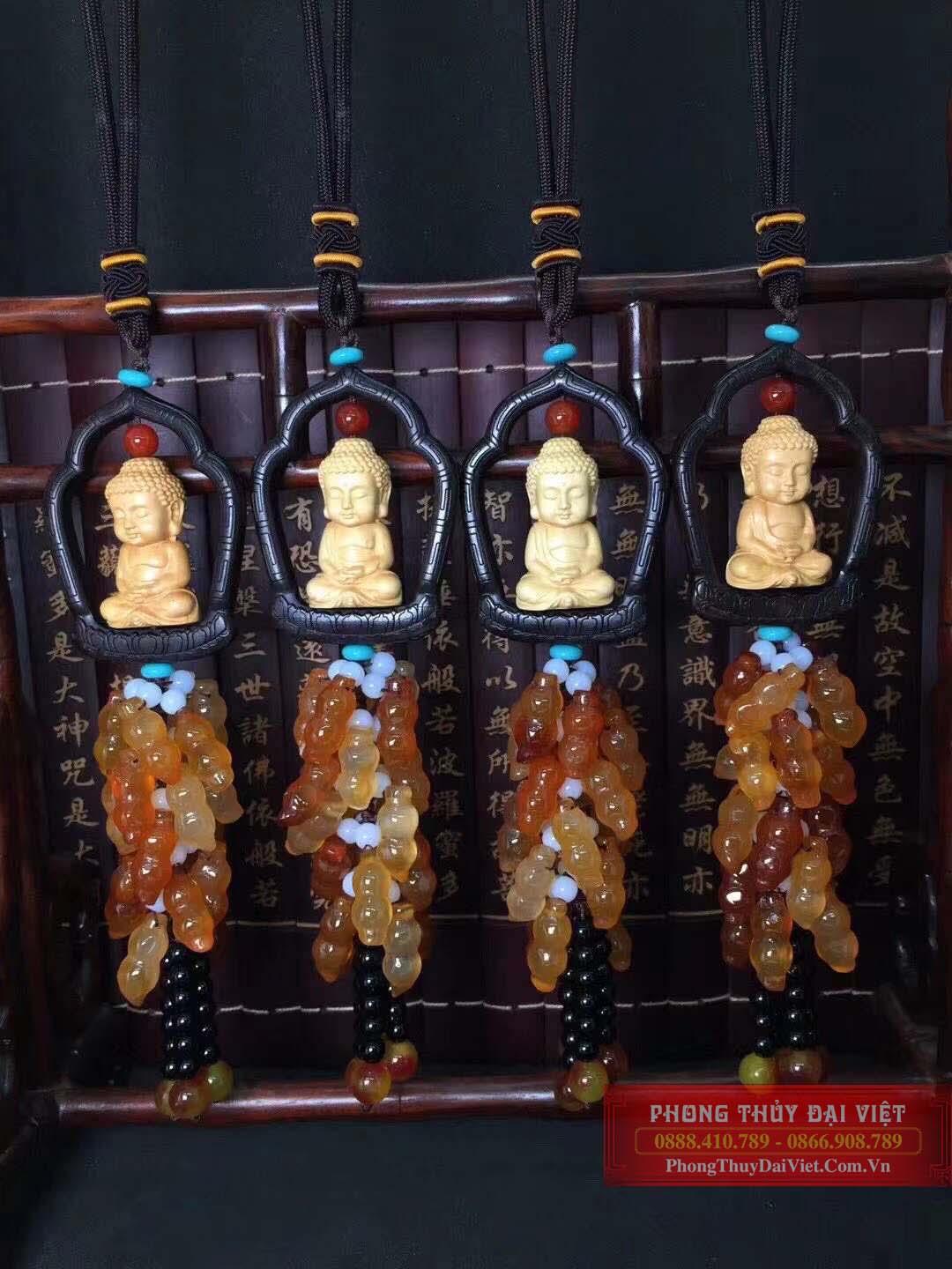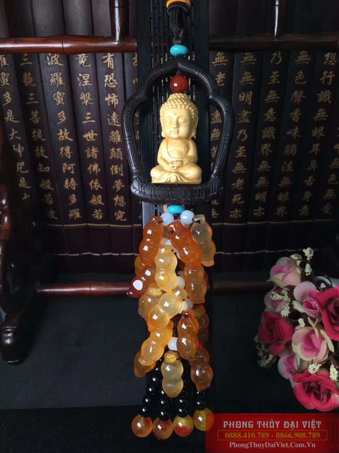 Dây treo phong thuỷ tựơng Phật từ gỗ hoàng dương với nhiều hồ lô làm từ đá mã não và các sợi tua rua rủ xuống là vật phẩm mang nhiều ý nghĩa.