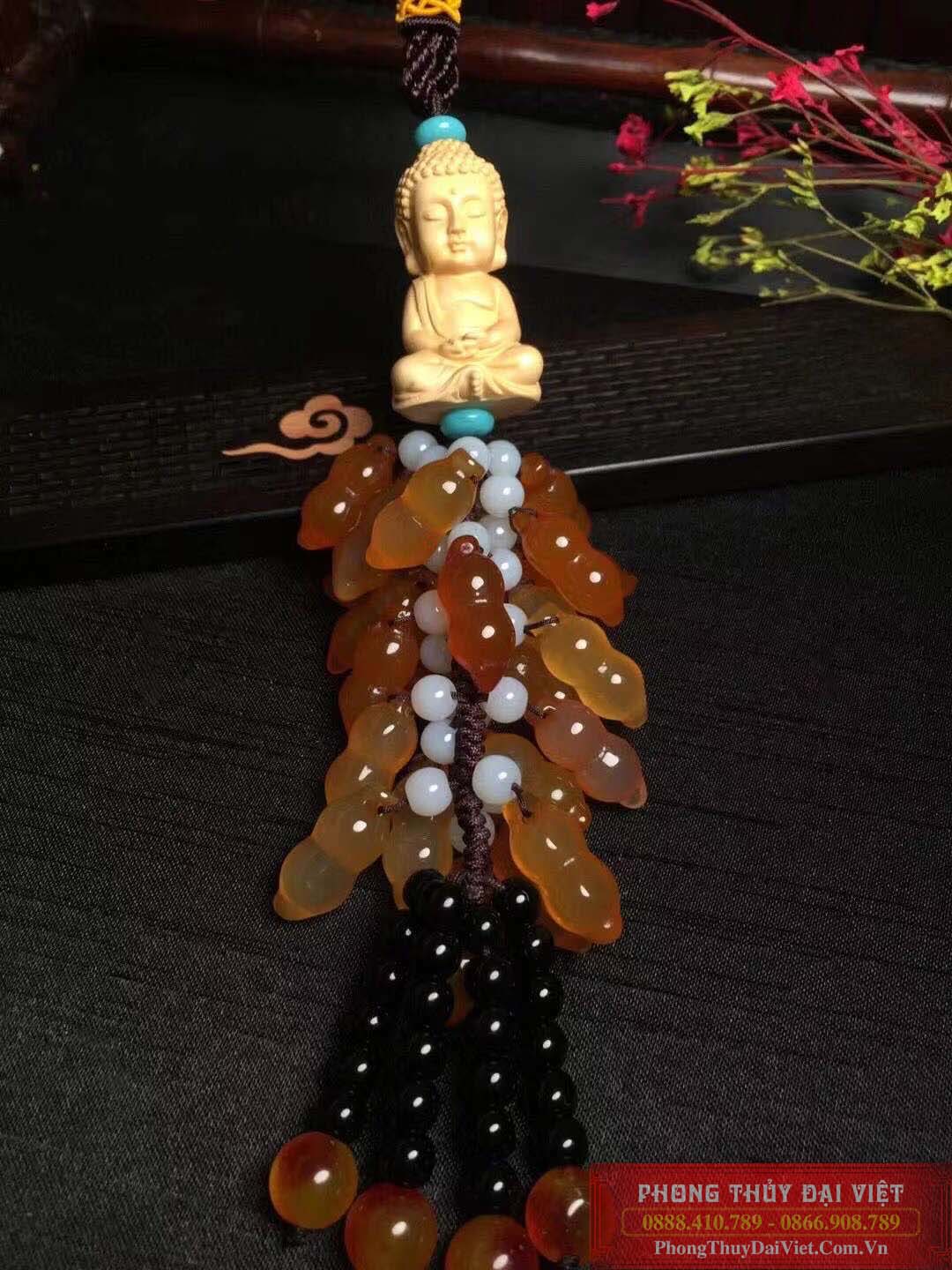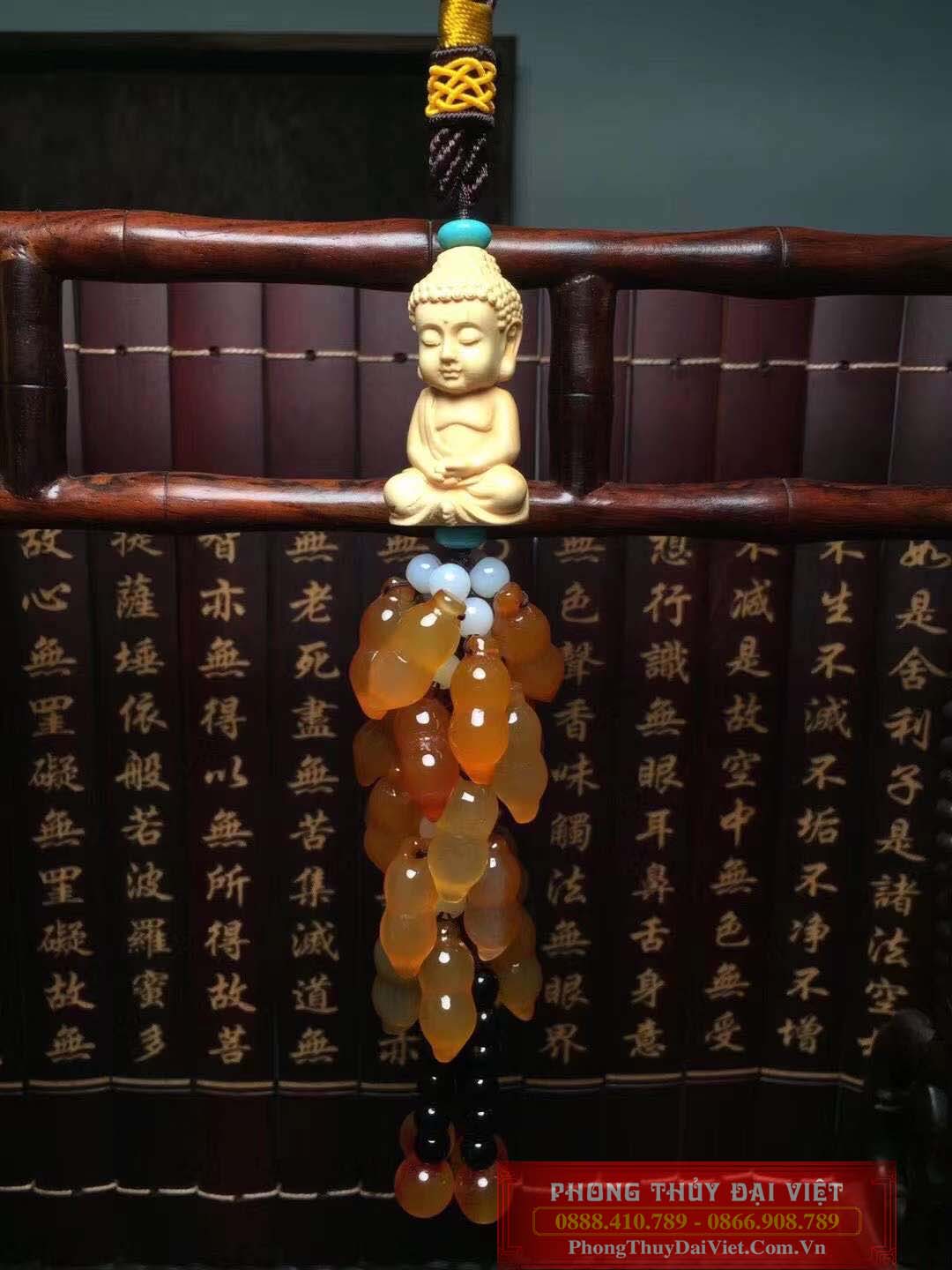 Dây treo phong thuỷ mặt Phật từ gỗ hoàng dương với nhiều hồ lô làm từ đá mã não và các sợi tua rua rủ xuống là vật phẩm mang nhiều ý nghĩa.