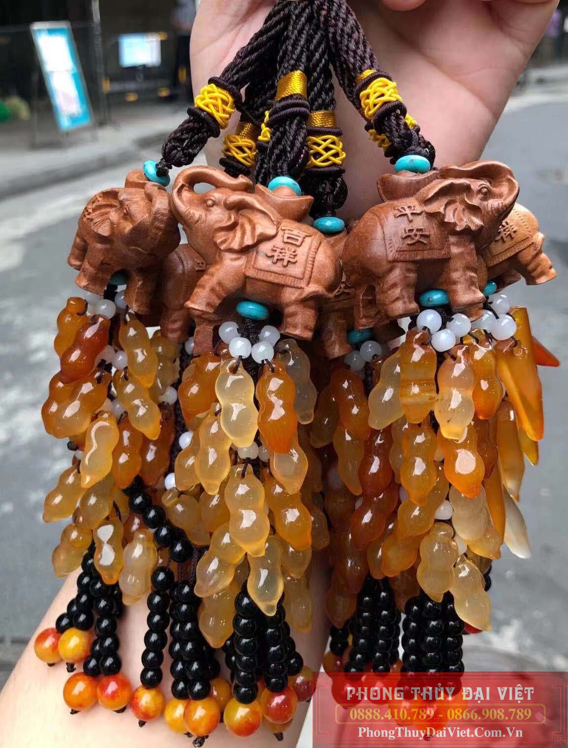 Dây treo ô tô phong thuỷ có tượng voi từ gỗ hoàng dương với nhiều hồ lô làm từ đá mã não và các sợi tua rua rủ xuống là vật phẩm mang nhiều ý nghĩa.