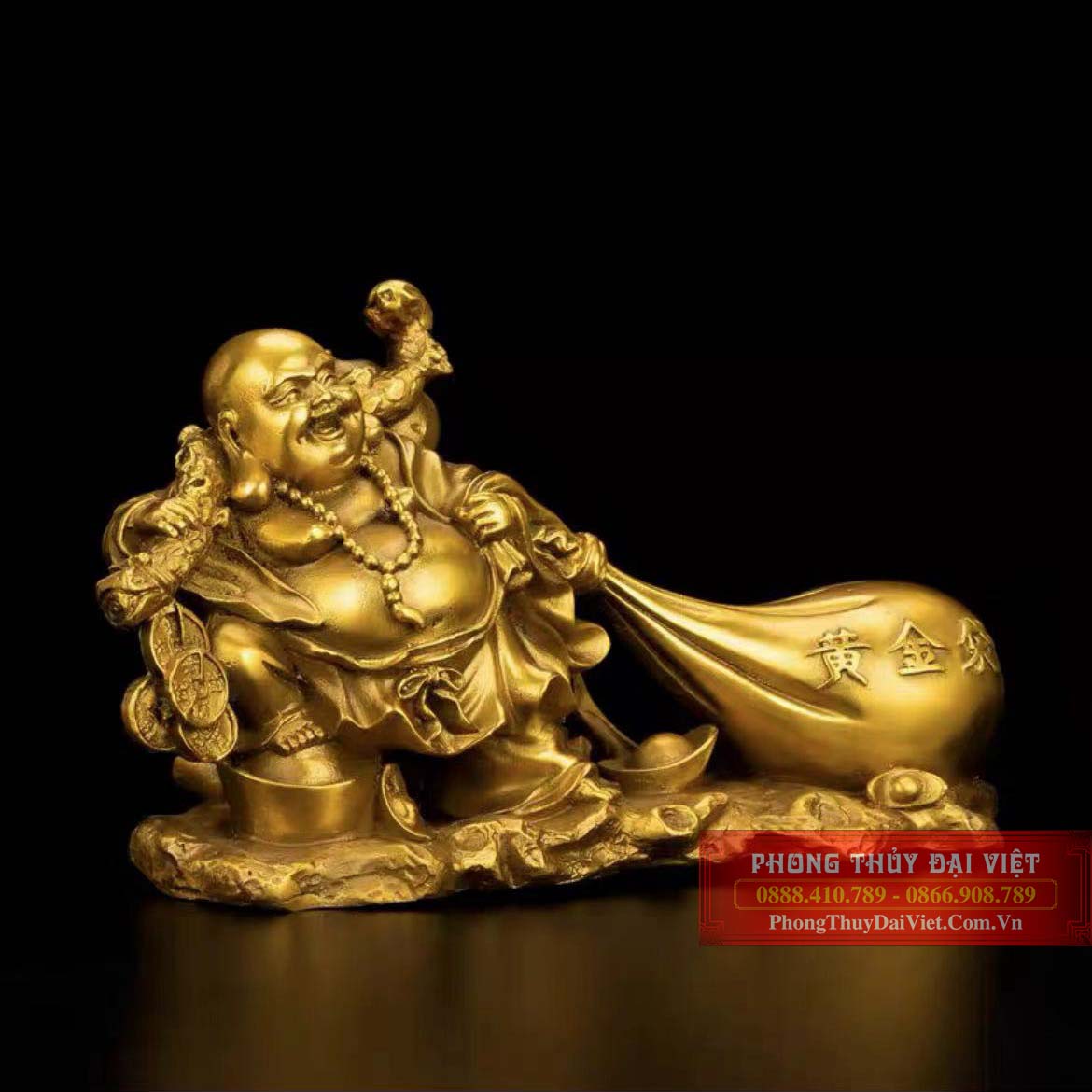 Phần đầu treo hồ lô rượu có khả năng hút cát khí, phần sau treo xâu tiền xu cổ biểu hiện cho sự dư dả, tài lộc. Tay còn lại kéo túi tiền lớn đại diện cho tiền bạc, của cải. Ngài đứng trên một phiến đá lớn có vài ba thỏi vàng, một chân co lên đặt trên thỏi tiền Kim Nguyên Bảo,rất tự nhiên, thoải mái như mang đến cuộc sống an nhiên, lạc quan, vui vẻ, hạnh phúc.