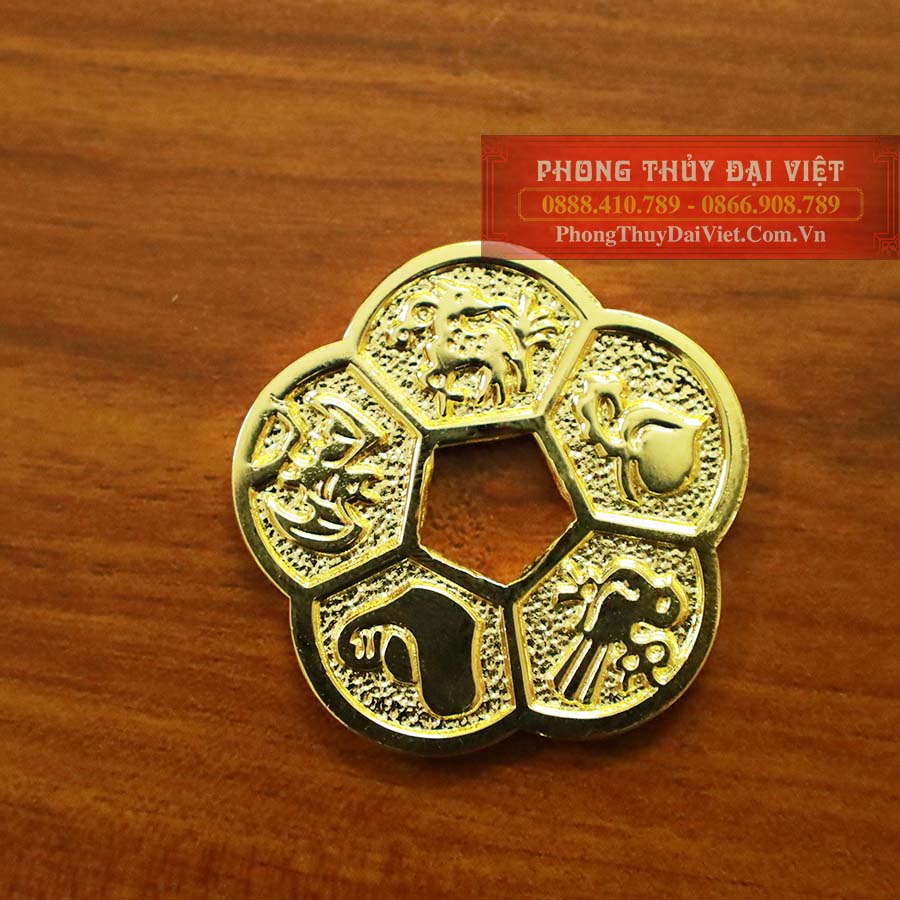 - Trên mỗi cánh hoa mai sẽ được chạm trổ ngũ tự gồm Thọ, Mệnh, Trường, Phú, Quý. Mặt còn lại sẽ được khắc hình Đào tiên (trường thọ), Chim Khách (cát tường), Thỏi vàng (của cải), Dơi (phúc), Tuần Lộc (lộc). Chính vì vậy đồng tiền hoa mai thường được coi như 1 vật mang lại thu hút của cải tài lộc mang lại may mắn cho gia chủ.
