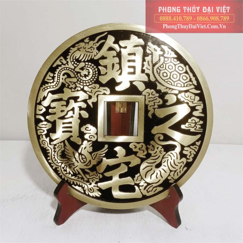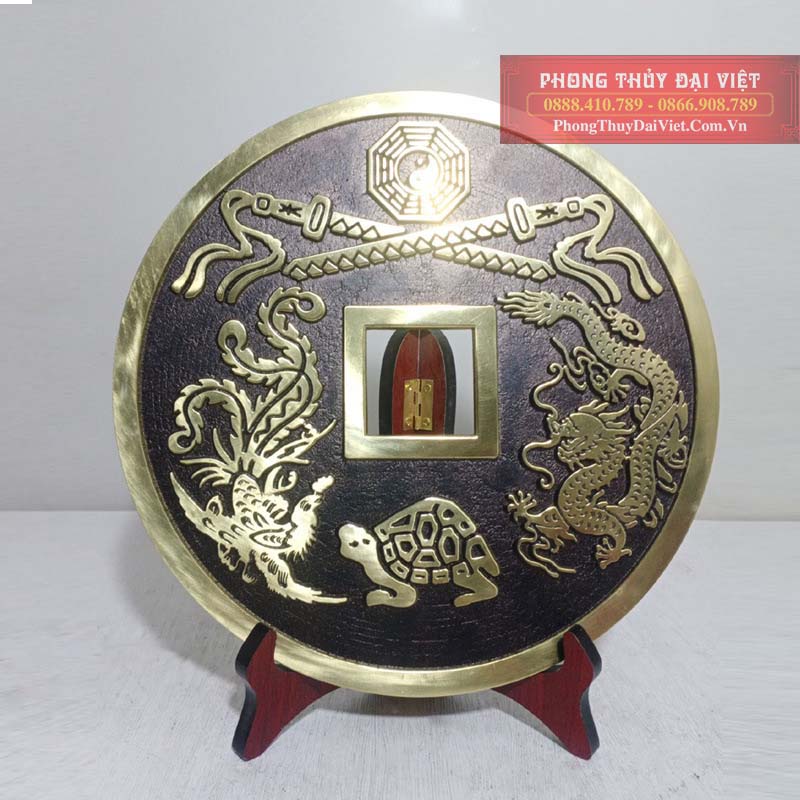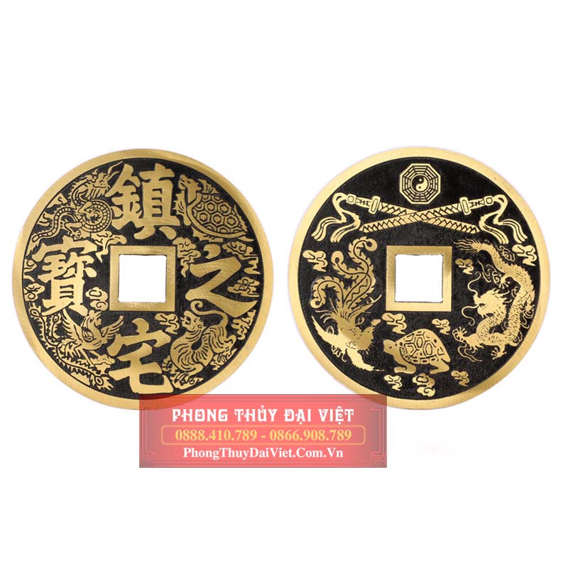 Đồng xu có hình tròn tượng trưng cho trời, ở giữa đục lỗ hình vuông tượng trưng cho đất. Trời ở ngoài đất ở trong tượng trưng cho quẻ Thái - tức sự thịnh vượng. Mặt trước của đồng xu có in hình tứ linh: Long - Lân – Quy - Phụng. Tứ linh trong phong thủy là biểu tượng của sự cao sang, quyền quý, đem lại may mắn, tài lộc.
