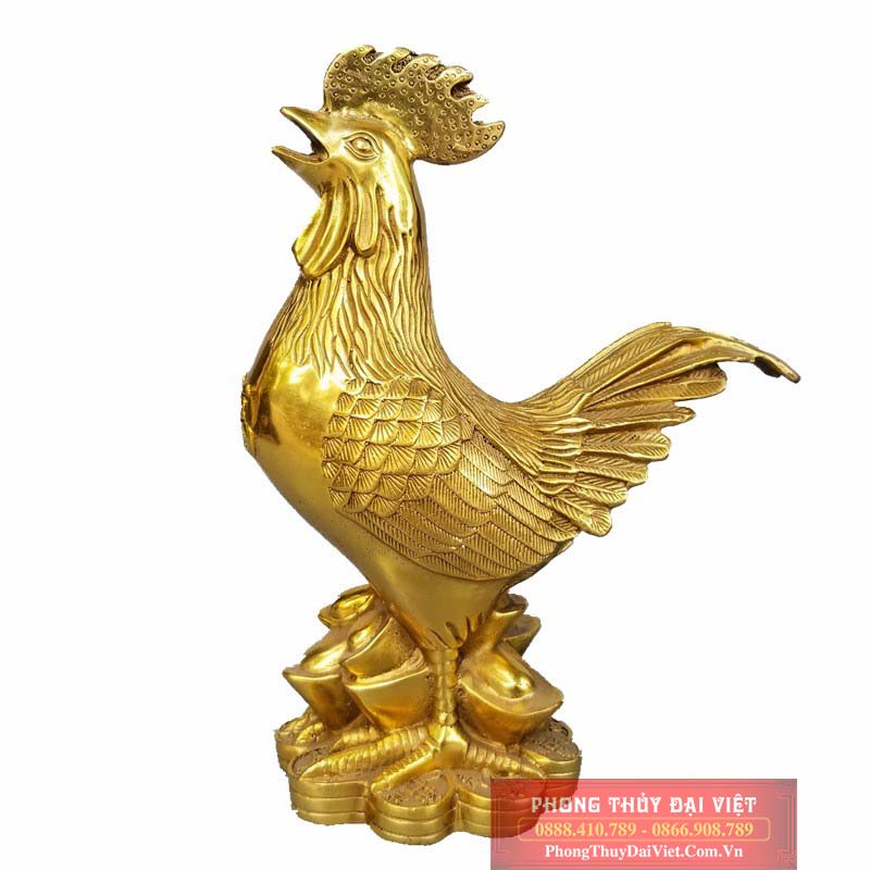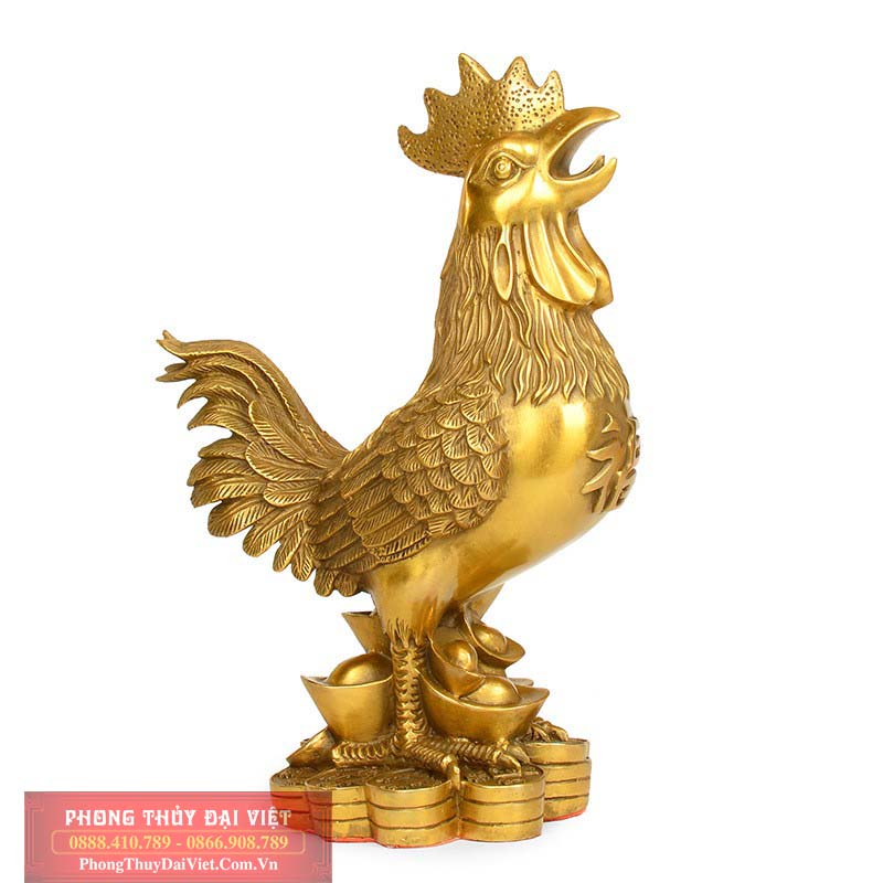 Gà trống với chiếc mào to, dựng đứng đầy kiêu hãnh trên đầu nhu chiếc vương miện. Cặp mỏ sắc nhọn, đôi mắt nhỏ được tái hiện rất chân thực, sống động. Đầu ngẩng cao hướng về mặt trời, mỏ như đang cất tiếng gáy để báo hiệu bình minh, xua tan bóng tối và các thế lực xấu. Gà đứng ưỡn ngực để lộ chữ Phúc bằng chữ Hán như hứa hẹn mang lại điều may mắn, phúc đức vẹn tròn. Chú đang đứng trên núi tiền vàng thể hiện sự giàu có, phú quý.