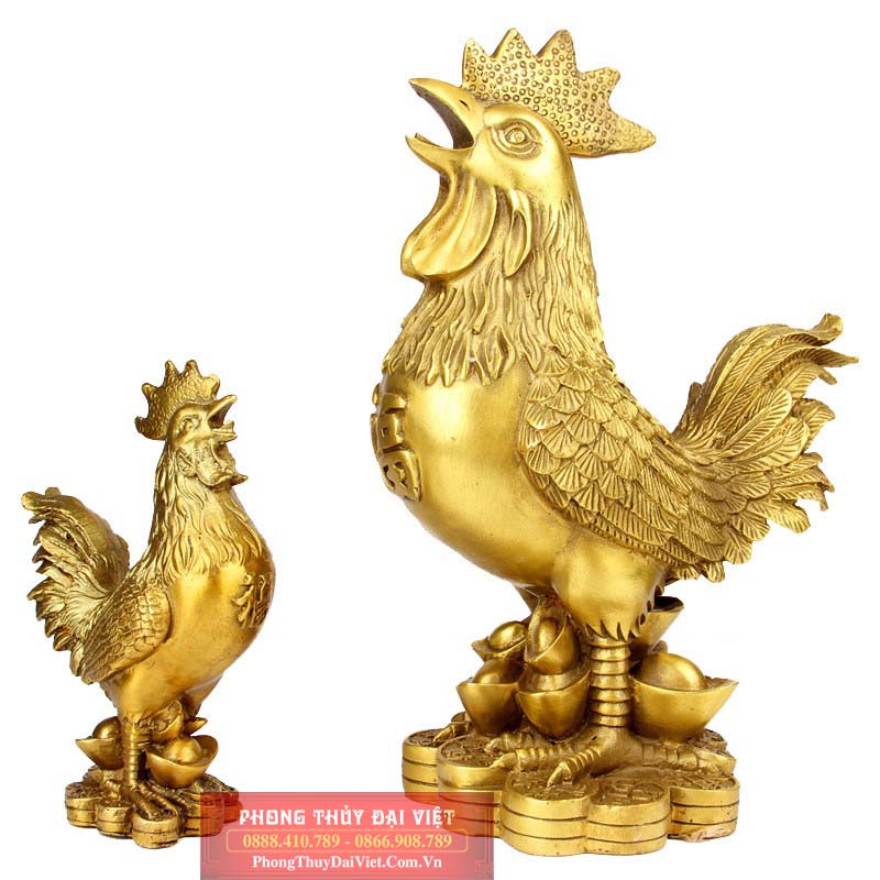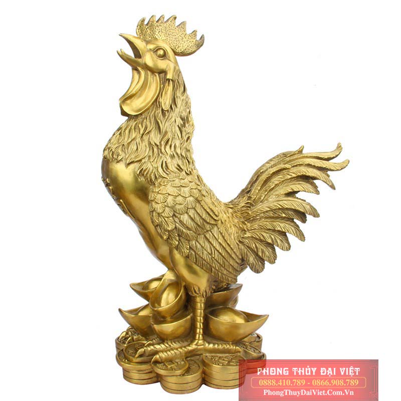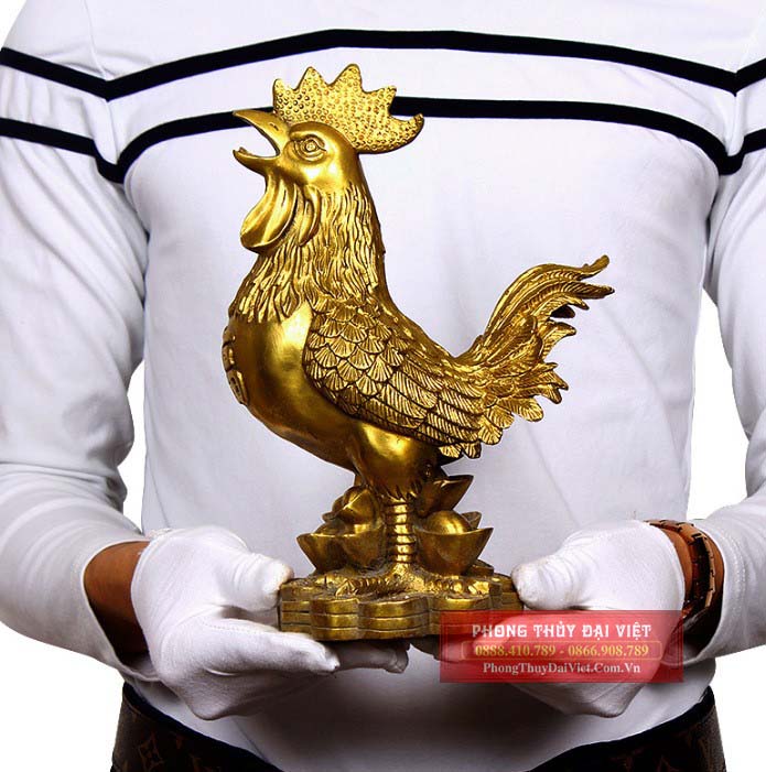 Gà trống với chiếc mào to, dựng đứng đầy kiêu hãnh trên đầu nhu chiếc vương miện. Cặp mỏ sắc nhọn, đôi mắt nhỏ được tái hiện rất chân thực, sống động. Đầu ngẩng cao hướng về mặt trời, mỏ như đang cất tiếng gáy để báo hiệu bình minh, xua tan bóng tối và các thế lực xấu. Gà đứng ưỡn ngực để lộ chữ Phúc bằng chữ Hán như hứa hẹn mang lại điều may mắn, phúc đức vẹn tròn. Chú đang đứng trên núi tiền vàng thể hiện sự giàu có, phú quý.