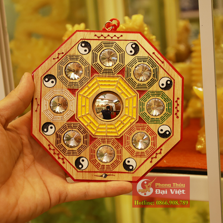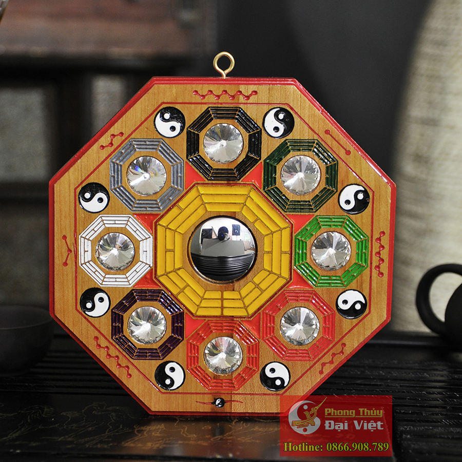 + Được chế tác từ gỗ đào tự nhiên, gương bát quái gỗ đào cửu cung gồm có 9 cung, cung chính giữa là bát quái cầu lồi, 8 cung ở 8 hướng xung quanh được đính mặt pha lê thủy tinh vát cạnh giúp hóa giải năng lượng xấu tốt hơn.
