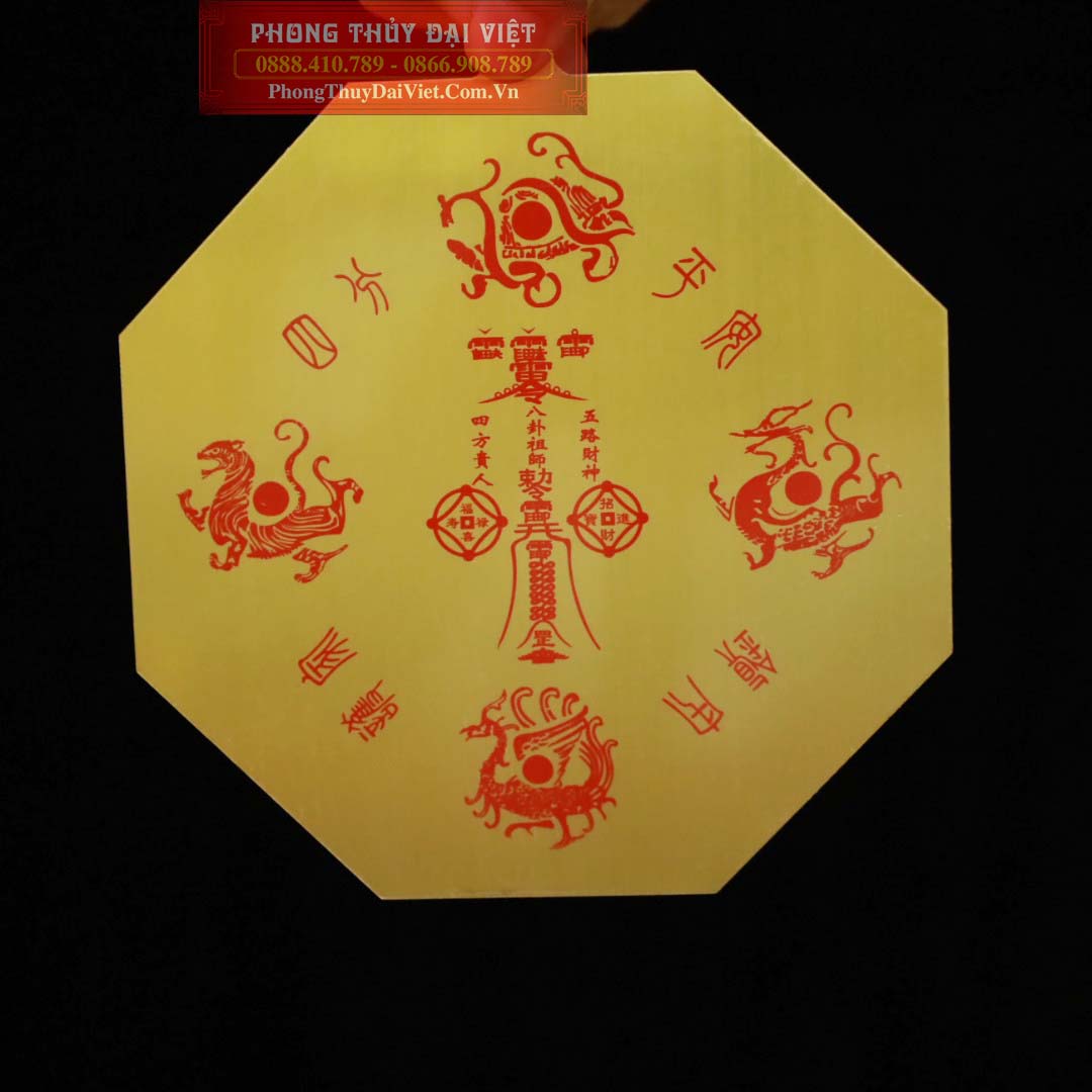 Gương có hình bát giác. Phía trên gương vẽ hình bát quái gồm 8 quẻ: càn, đoài, ly, chấn, tốn, khảm, cấn, khôn với các nét vẽ rõ ràng dễ nhận biết và ở giữa là biểu tượng âm dương ngũ hành có tác dụng trấn trạch, hóa hung thành cát.
