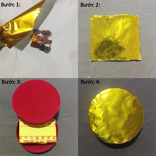 Bước 3+4: Đặt gói thất bảo vừa gói ở 2 bước trên vào trong hộp nhung đỏ, Tờ Hiệu sau khi ghi xong được gấp nhỏ và đặt lên phía trên gói thất bảo, rồi đậy hộp nhung đỏ lại, sau đó gói lại bằng giấy trang kim như hình ảnh và video dưới đây.