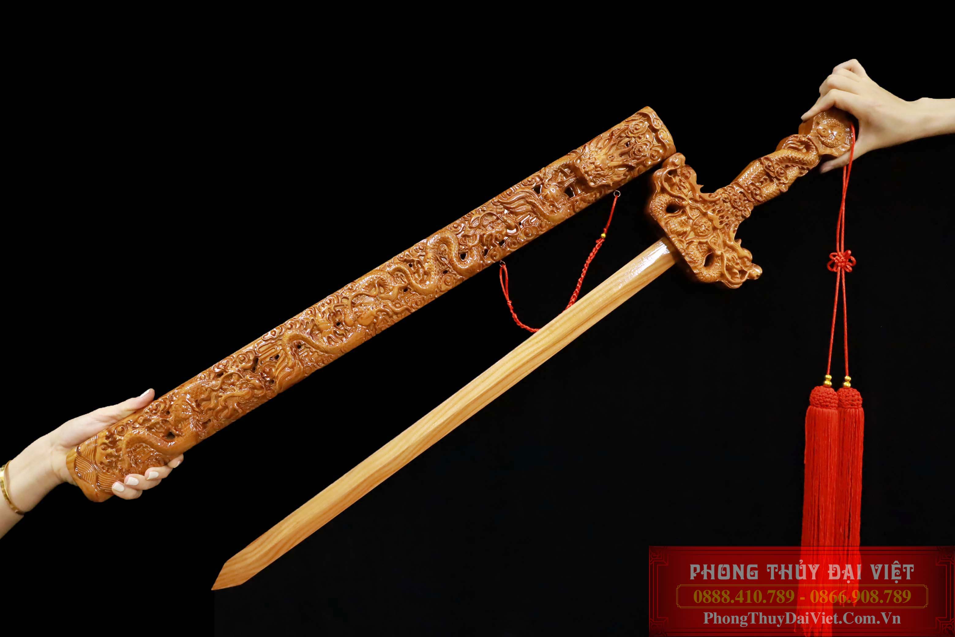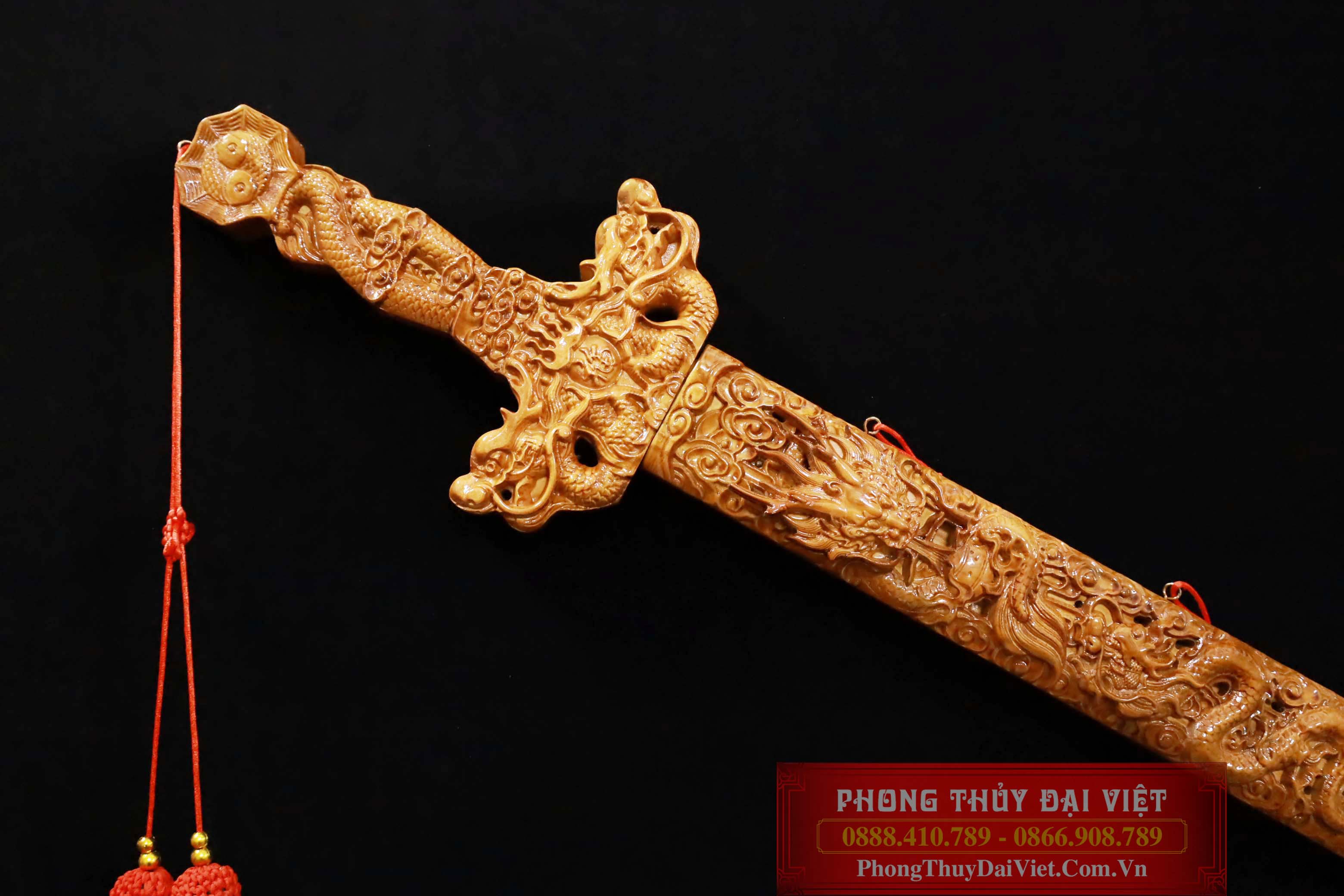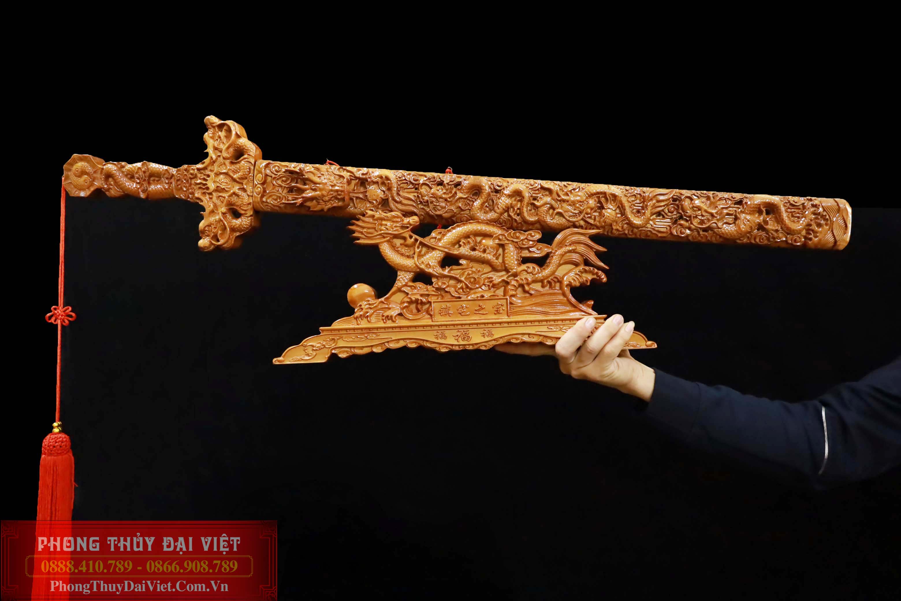 + Kiếm Gỗ Đào Khắc Rồng Chiều Tài Hút Lộc