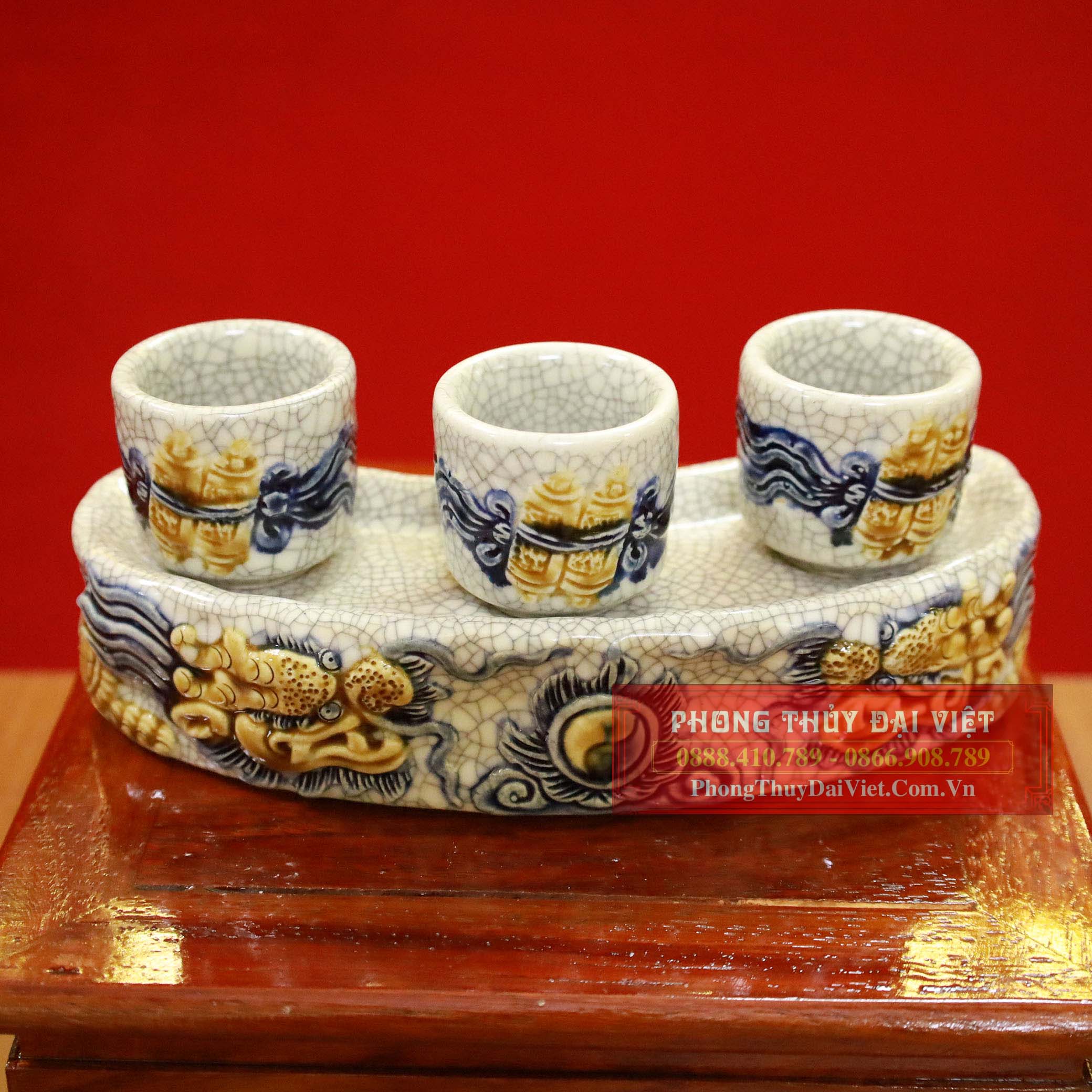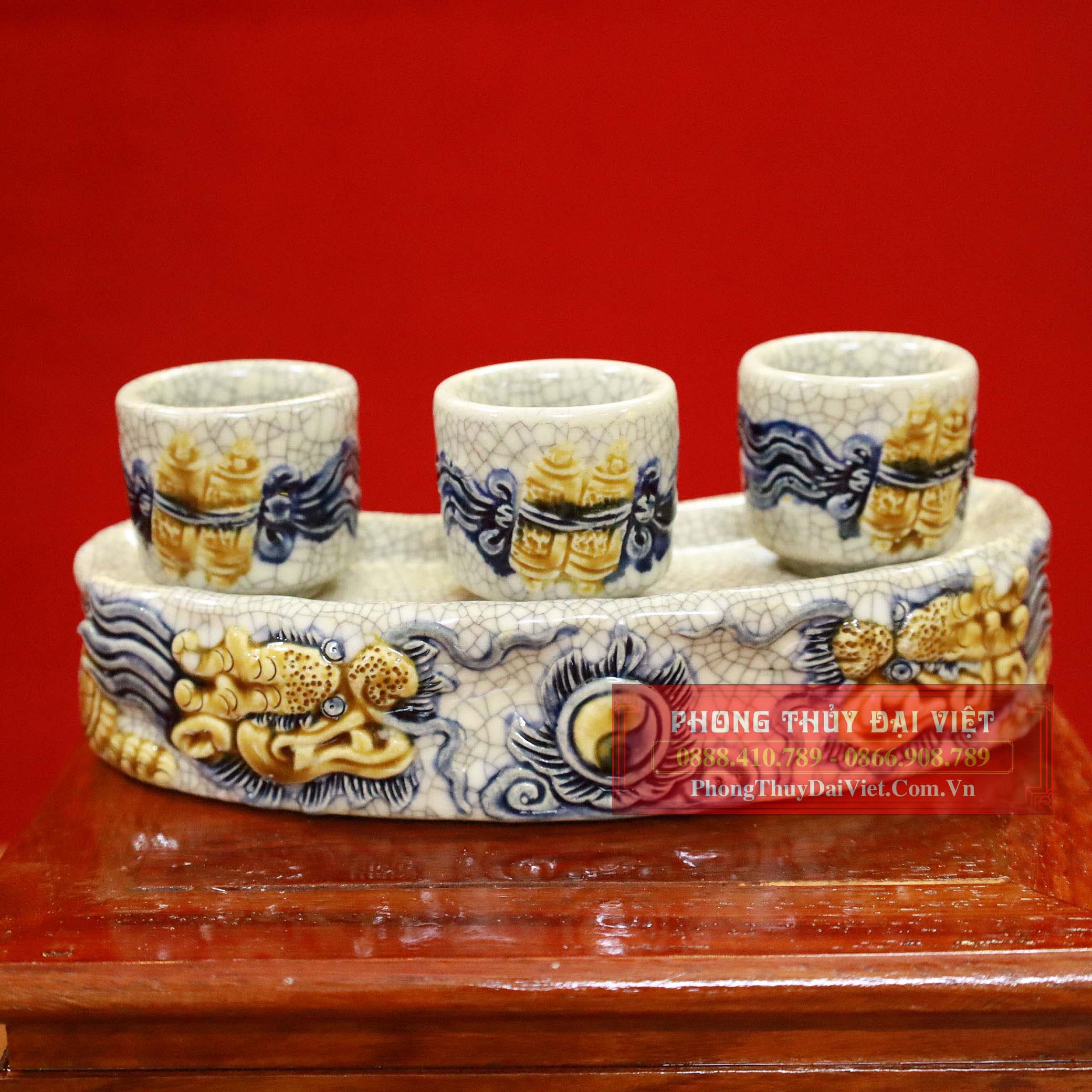 Bộ kỷ ngai 3 chén cong men rạn đắp nổi Bát tràng vẽ rồng