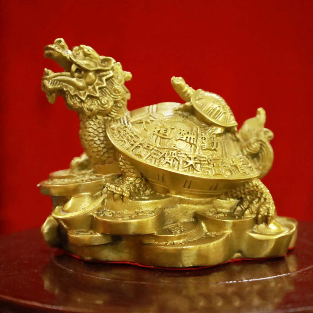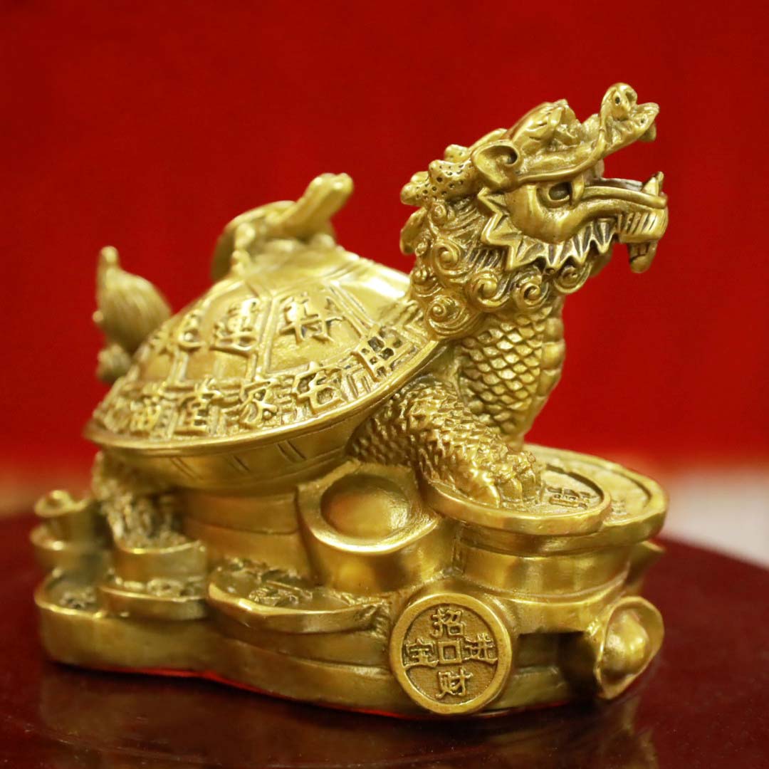 Với hình ảnh đầu rồng ngẩng cao, miệng há rộng oai phong, dũng mãnh. Trên lưng cõng rùa con, chân đạp trên núi tiền vàng. Sản phẩm được thể hiện vô cùng sắc nét, tinh xảo.