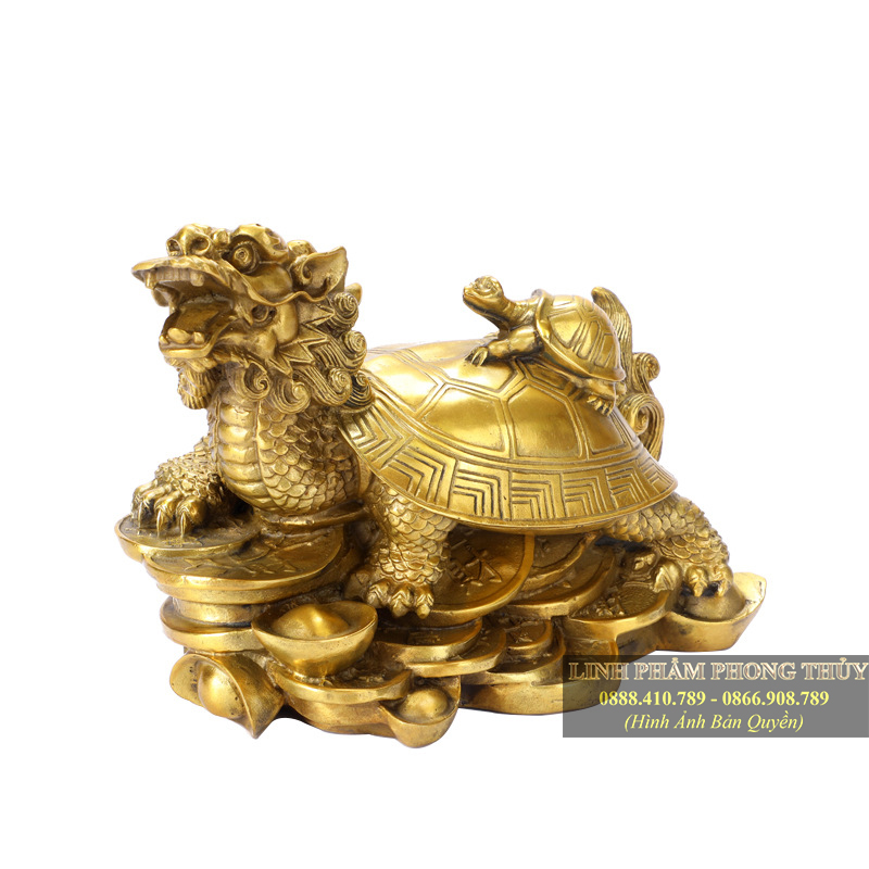 Long Quy đồng nguyên chất trên lưng cõng con là linh vật được dùng trong phong thuỷ nhằm cầu đinh quý, sức khoẻ và trường thọ . Đầu của linh vật này là rồng biểu tượng cho sự may mắn, có sức mạnh phi thường, được trời đất che chở, mang quyền lực lớn. Bên cạnh đó, thân rùa luôn che chở gia chủ khỏi những điều tai họa, mọi chuyện đều được như ý. Phía dưới là núi tiền, vàng làm bệ đỡ cho linh vật thể hiện mong muốn thịnh vượng, giàu sang sẽ luôn trường tồn và bền vững.