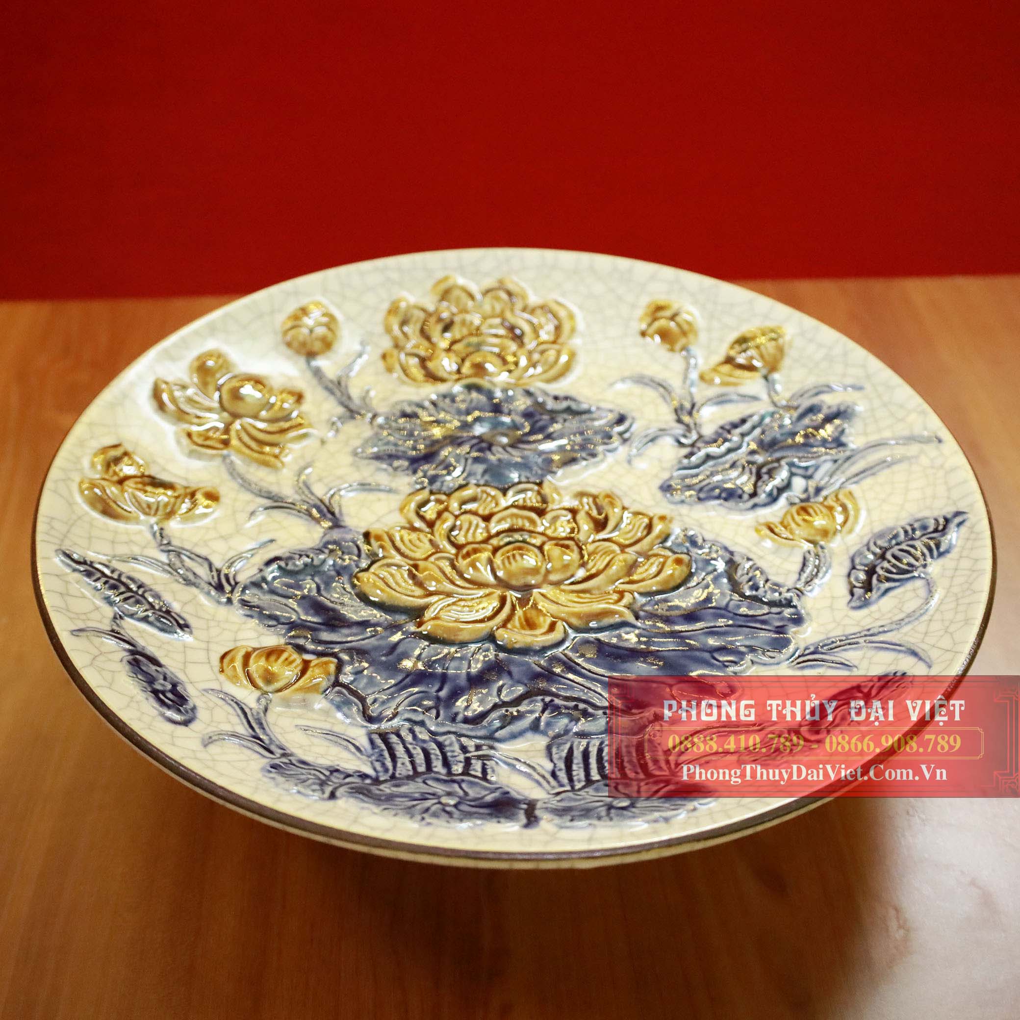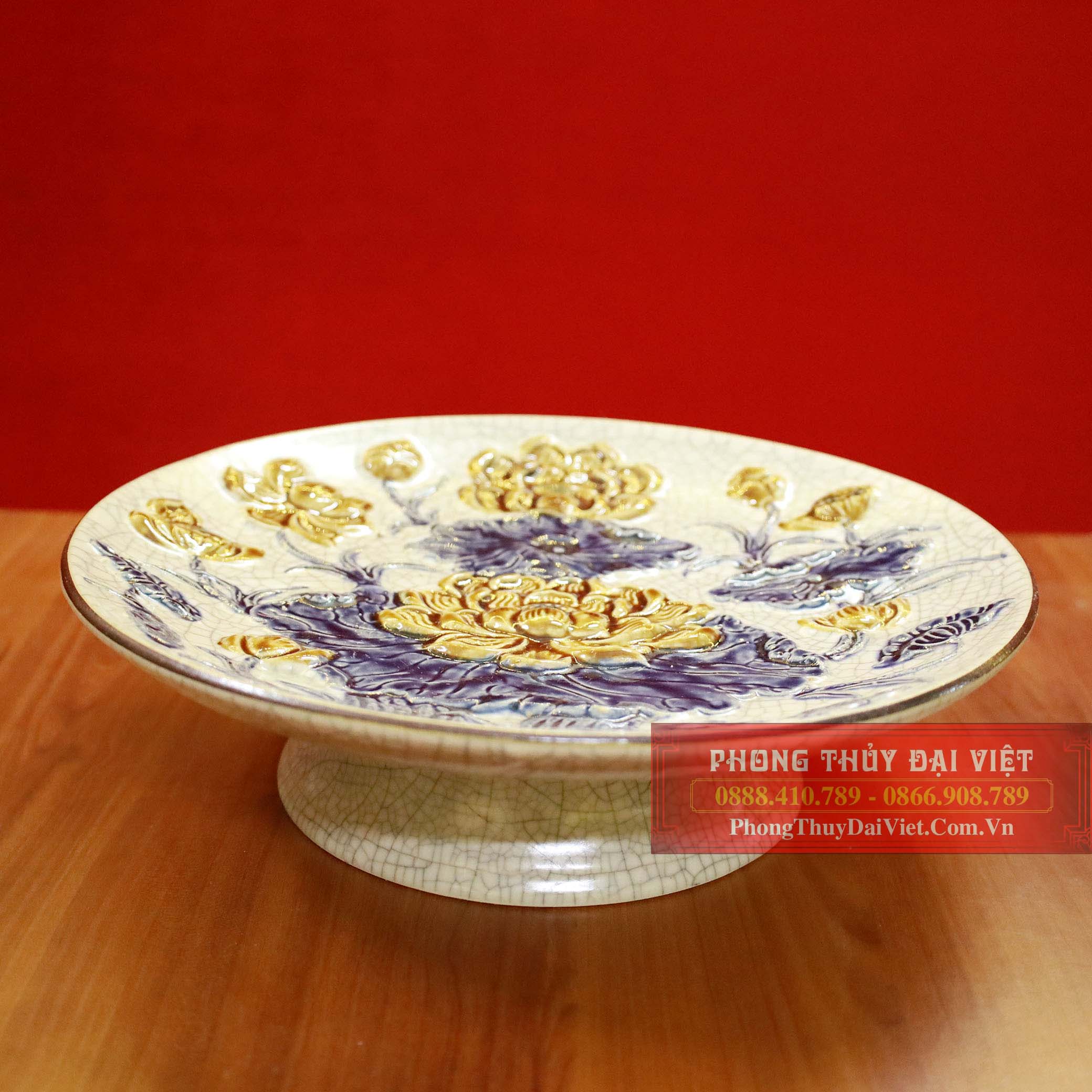 Mâm bồng sen men rạn Bát Tràng đắp nổi