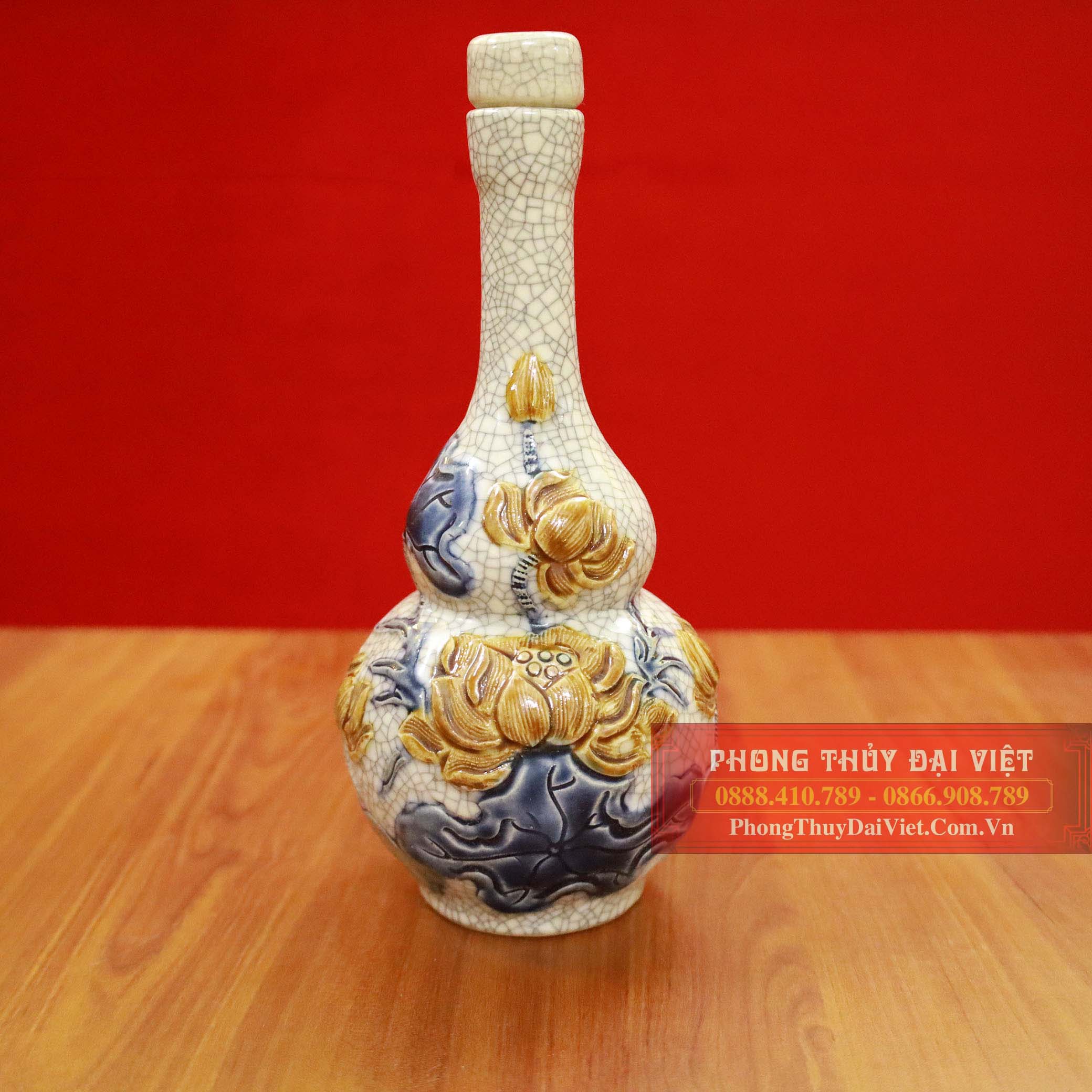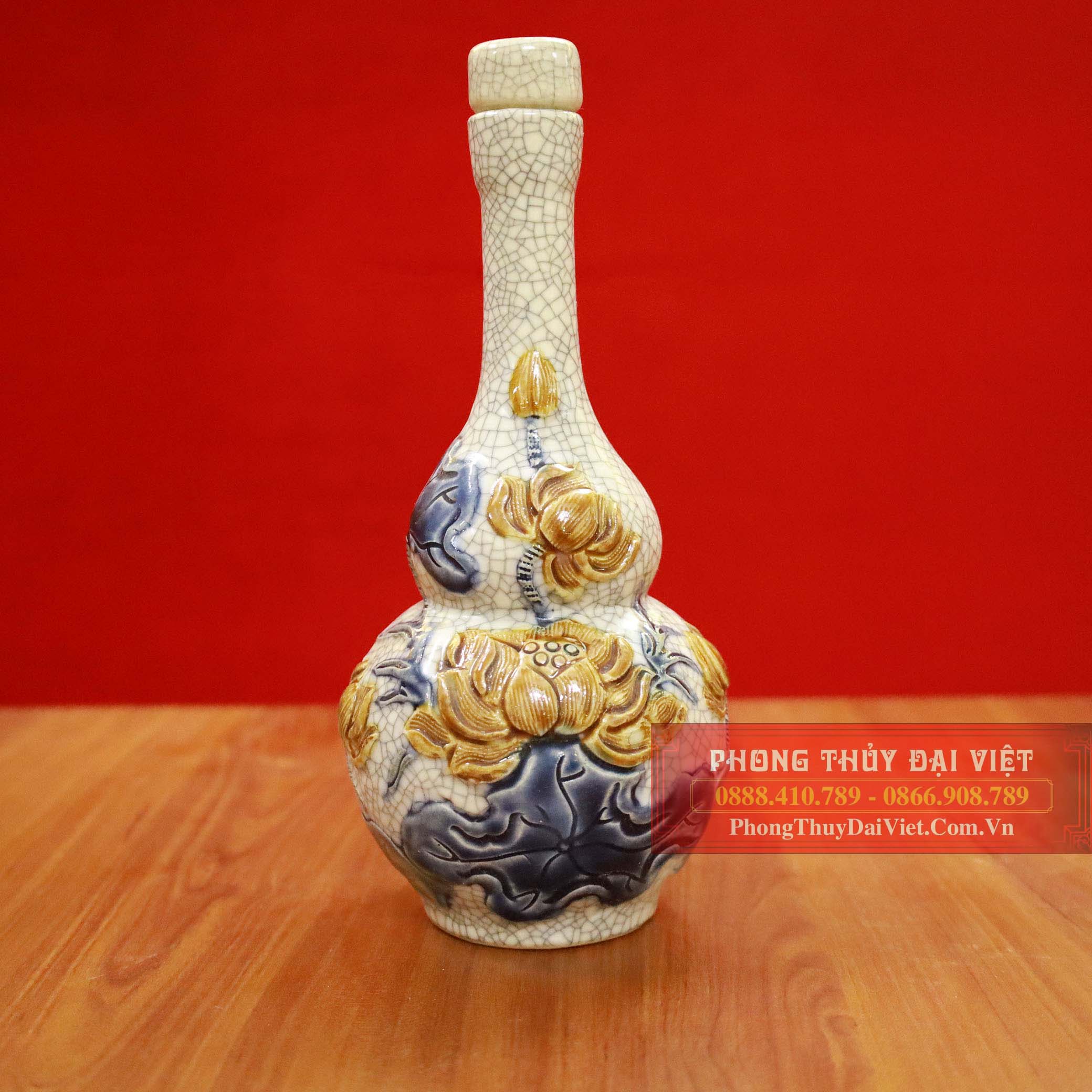 Thông tin về Nậm rượu hai bầu sen men rạn đắp nổi Nậm rượu sen men rạn thờ dùng để đựng rượu với ý nghĩa hóa giải hung khí, bảo vệ sức khỏe, mang đến hạnh phúc. Sản phẩm được làm hoàn toàn thủ công với chất liệu men rạn. Từng nguyên liệu được lựa chọn kỹ càng và chế tác từ đôi bàn tay khéo léo của những nghệ nhân có kinh nghiệm lâu năm và thẩm mỹ cao.