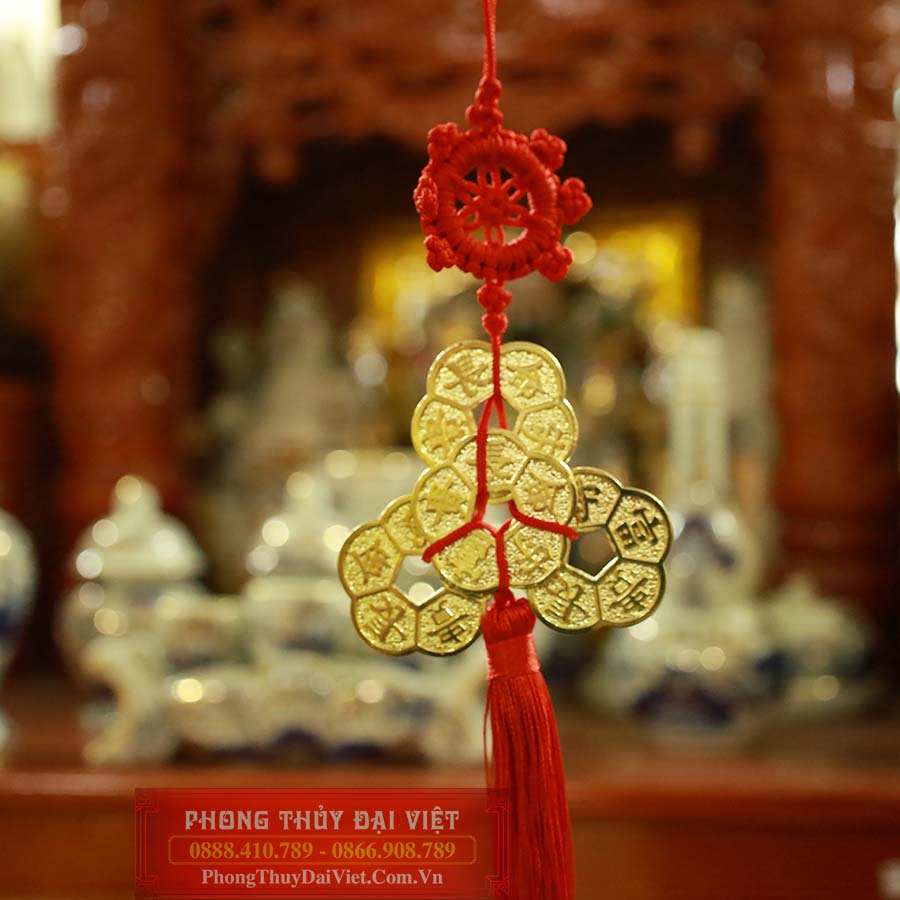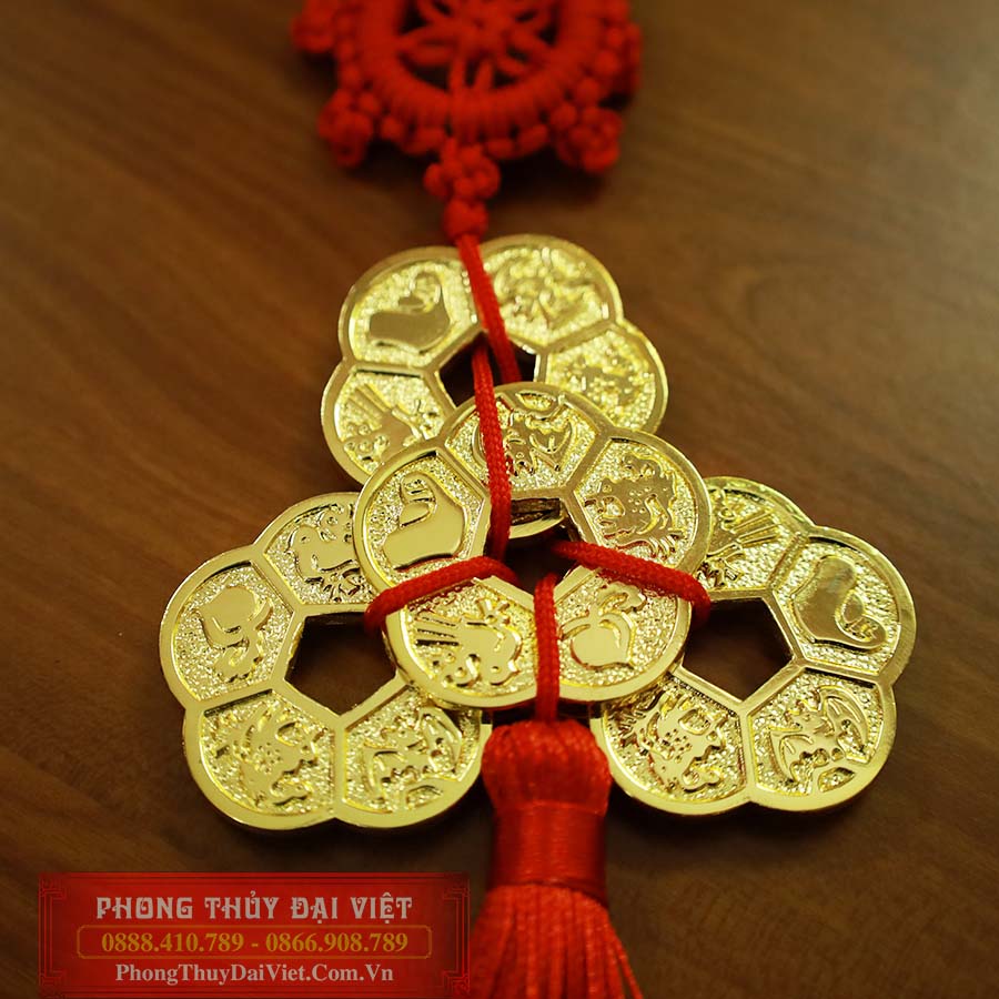 Đặc biệt, 5 đồng tiền hoa mai kết lại là ngũ phúc kết hợp với dây treo pháp luân đỏ giúp gia chủ đại cát đại lợi, tránh chuyện thị phi, kiện tụng giải trừ kẻ tiểu nhân