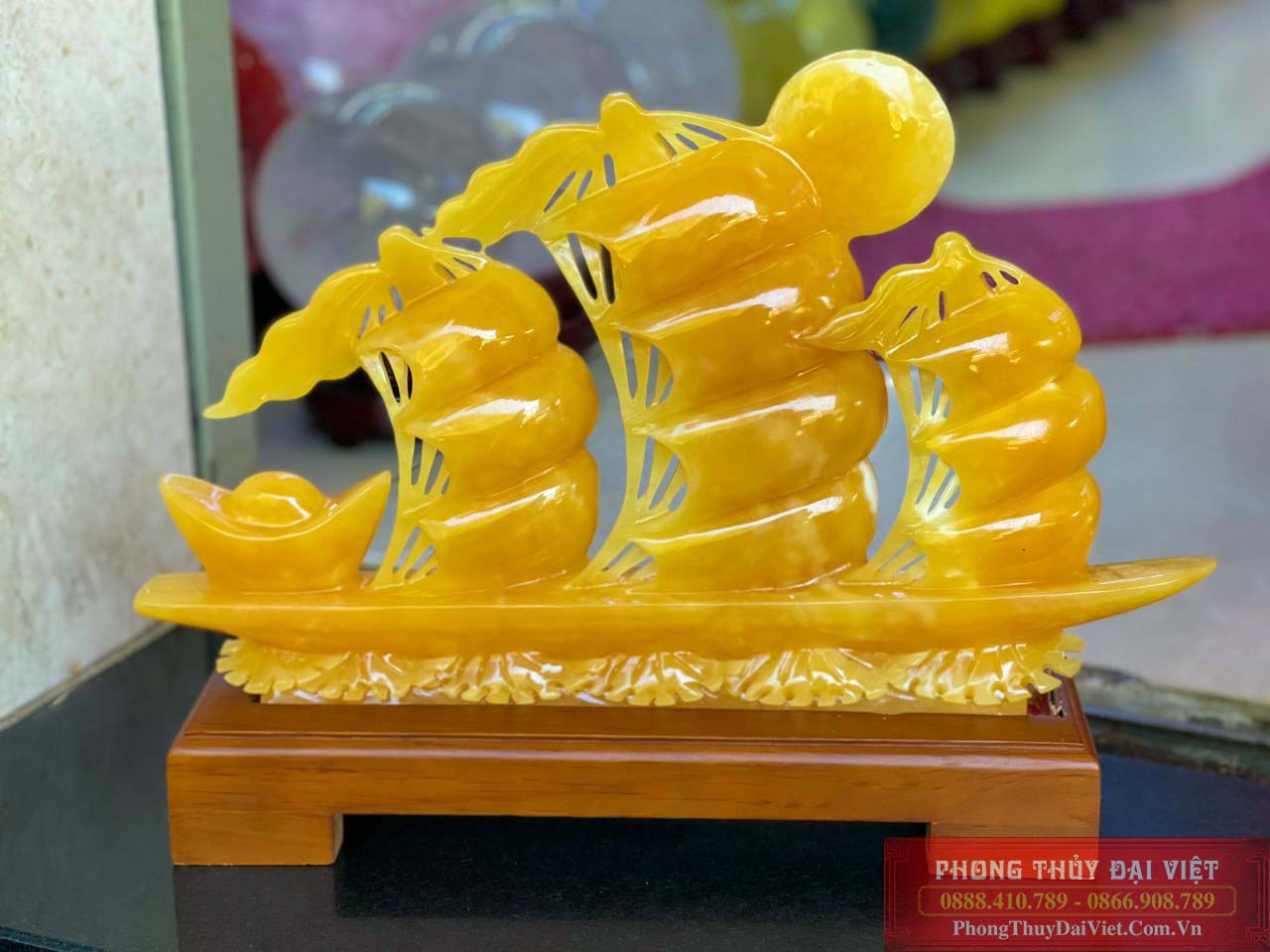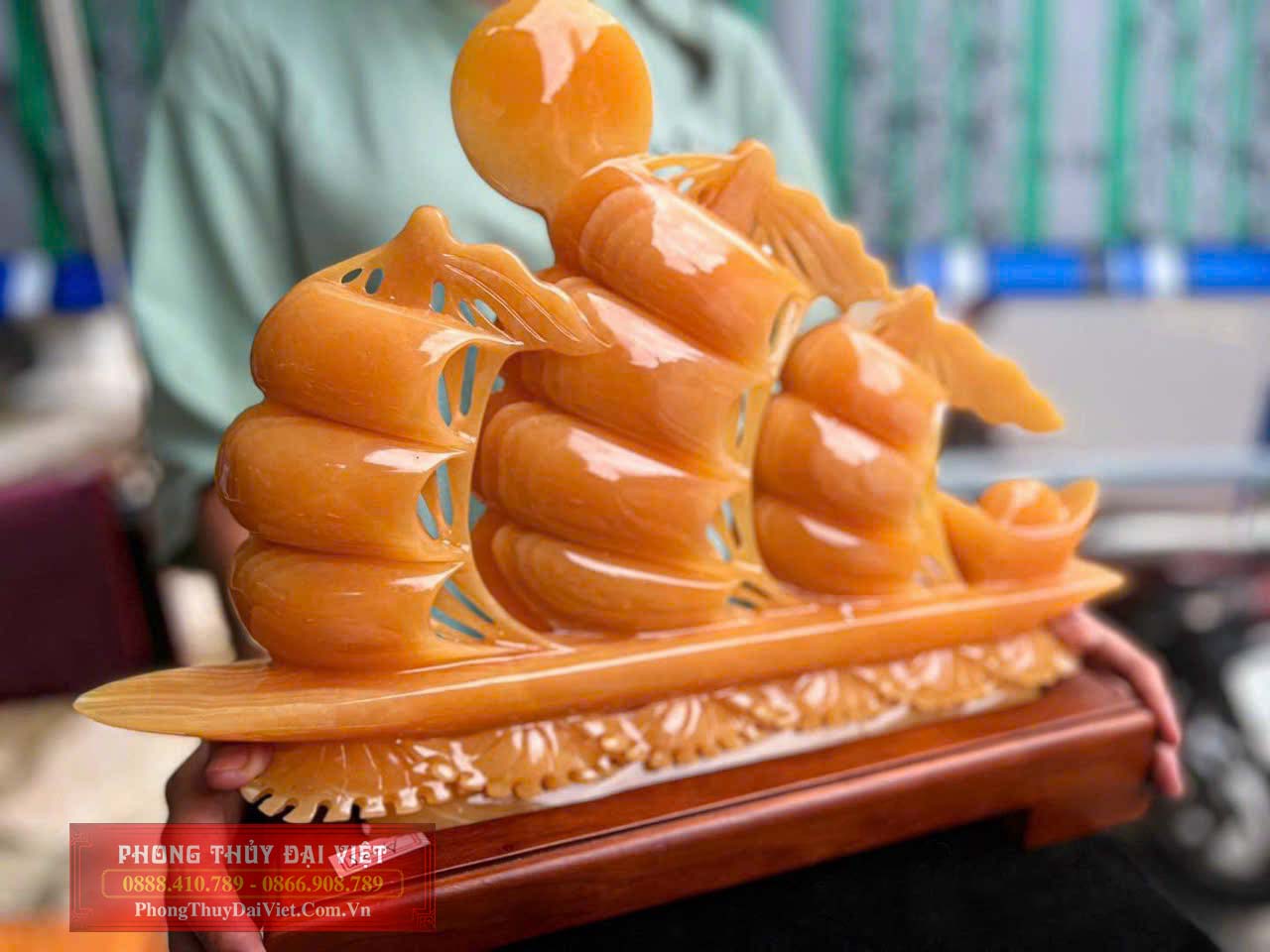 Thuyền được làm từ ngọc hoàng long tự nhiên. Ngọc hoàng long là một loại ngọc quý sở hữu màu vàng thuần khiết và uy quyền rất đặc trưng và độc đáo. Ngọc có độ dẻo dai tốt, đọ cứng cao, độ dầu tuyệt vời , kết cấu dày đặc, ánh sáng đẹp.
