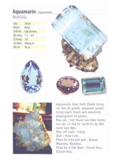 Đá Aquamarine là khoáng vật nằm trong nhóm Beryl có màu sắc xanh lá cây hoặc xanh lam đậm. Trong đó, loại màu xanh lá cây phổ biến hơn, giá trị thương mại thấp hơn so với loại có màu xanh lam đậm. Việc xử lý bằng nhiệt độ cao có thể thay đổi màu sắc của đá từ xanh lá cây sang xanh lam đậm. Vì vậy, hãy cẩn trọng khi mua những viên màu xanh lam đậm vì rất có thể chúng được xử lý nhiệt để tăng độ đậm của màu sắc.