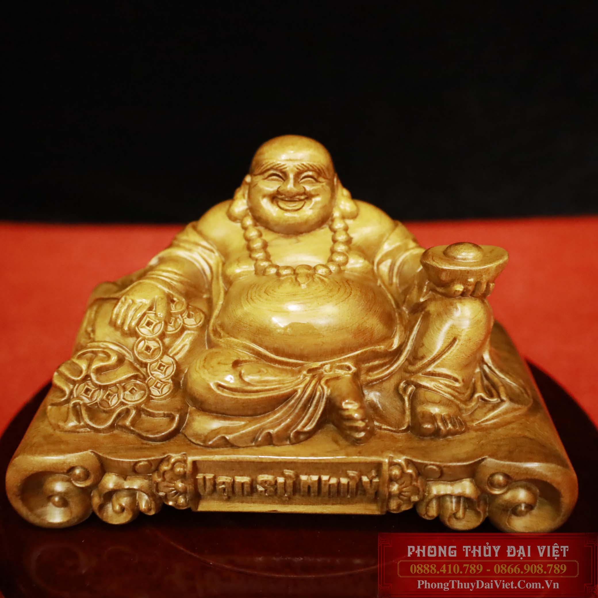 Tượng Di Lặc Vạn Sự Như Ý bằng gỗ bách xanh đại diện cho sự phú quý, may mắn và tài lộc. Ngắm nhìn tượng này có thể mang lại cảm giác niềm vui và sự hy vọng về một cuộc sống thịnh vượng và thành công.
